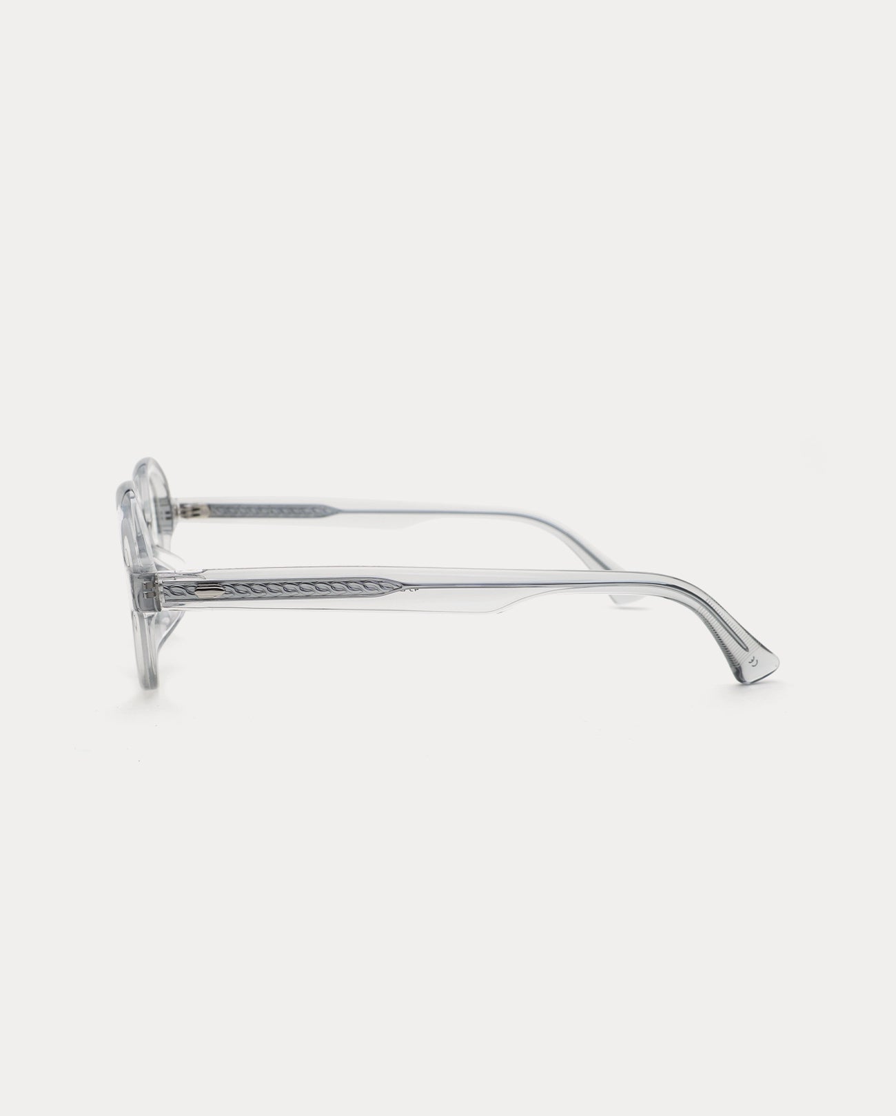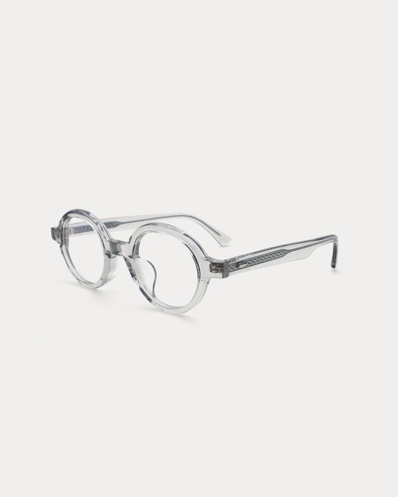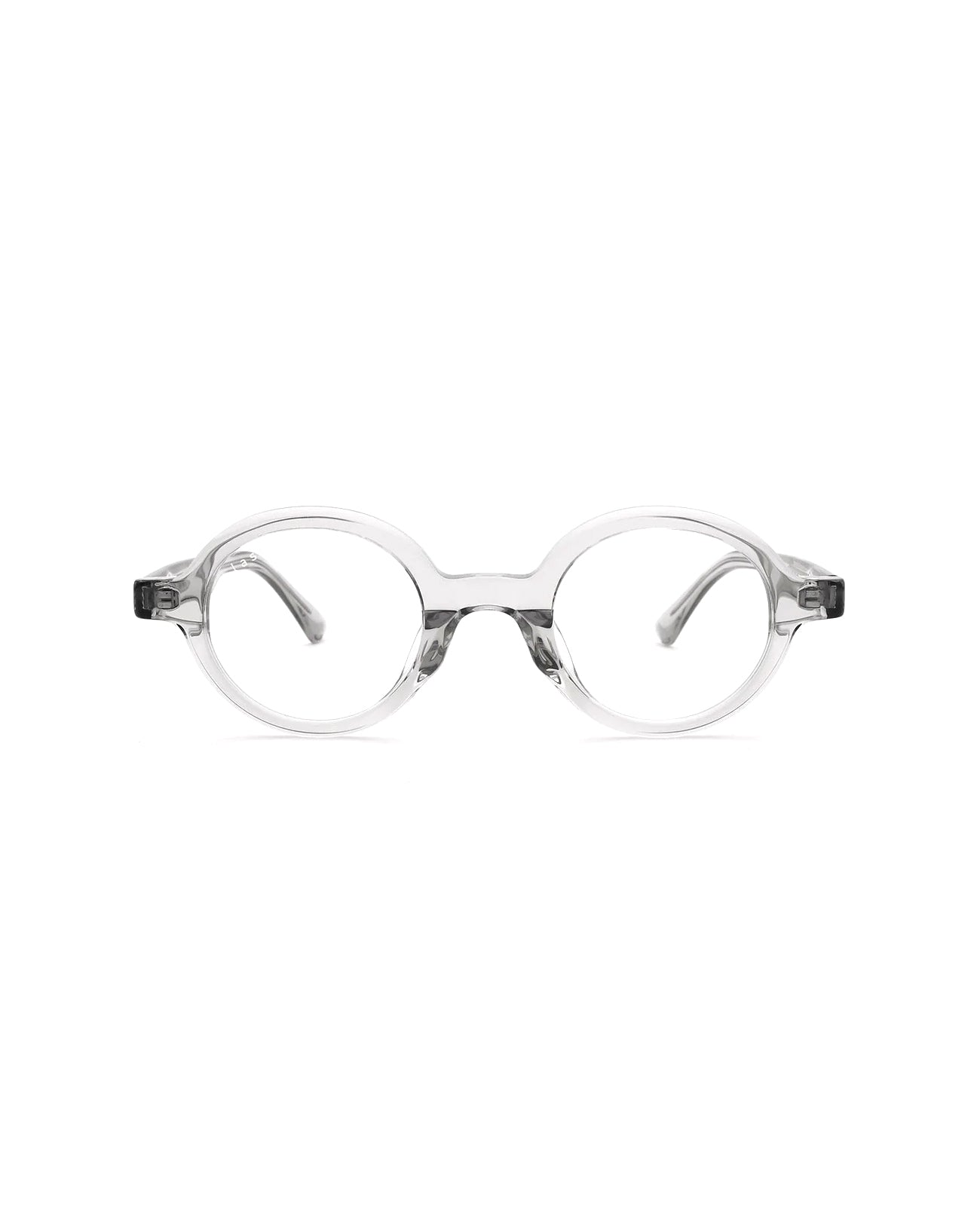 Oval acetate optical frame. The acetate from Mazzucchelli which is applied as the base material for the frame shows luxurious color and luster. The front design without rivets presents a minimal look. Moderate thickness, the soft edges of the upper line, and the voluminous bridge present a soft mood. The metal core patterns reflected on the temples make the product more luxurious.