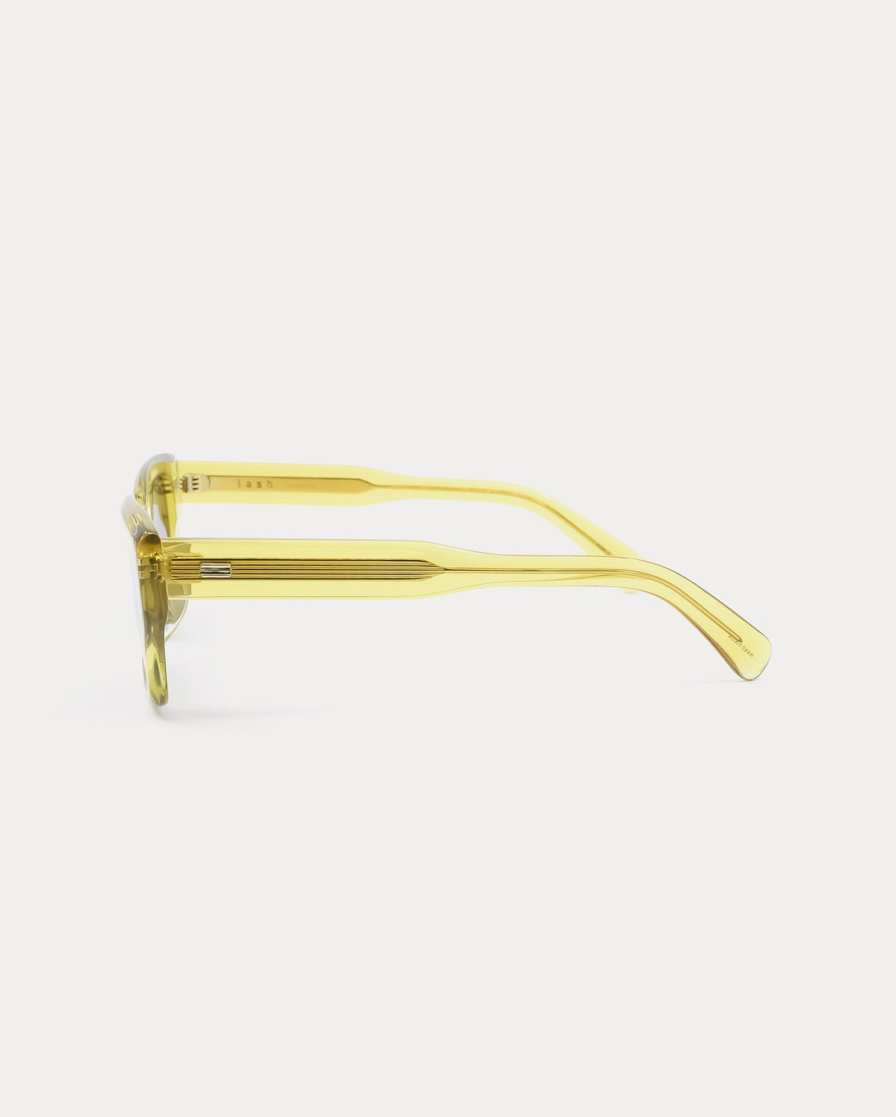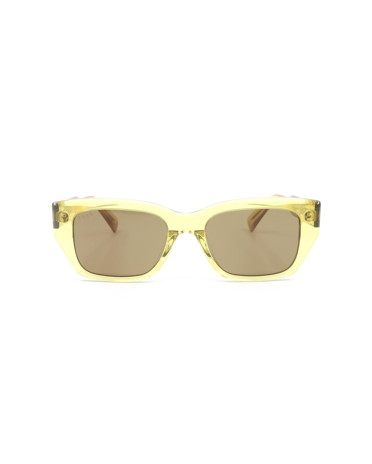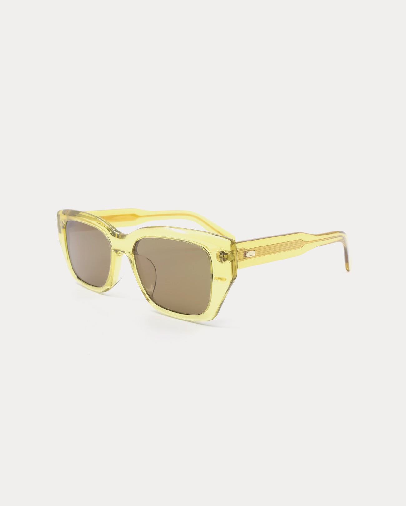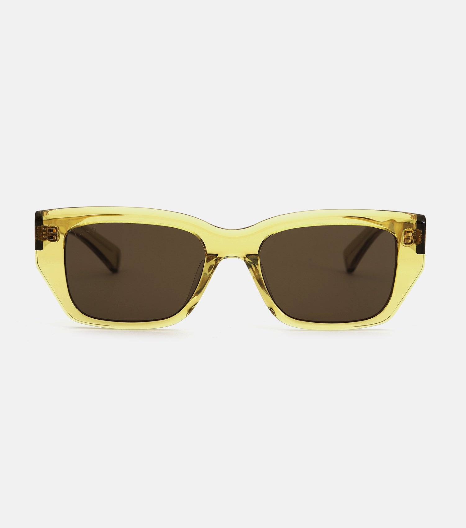 Square acetate sunglass frame. It features an overall bold and massing shape. The flat front is balanced with the various curved exterior angles. It creates a retro mood.