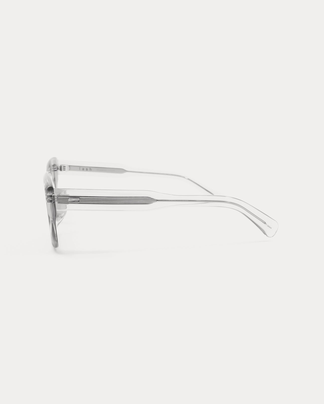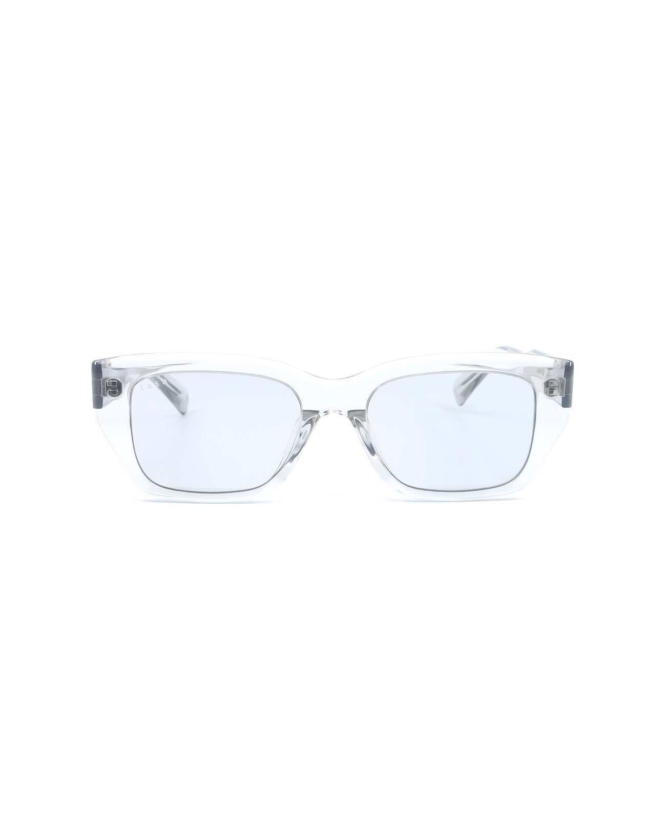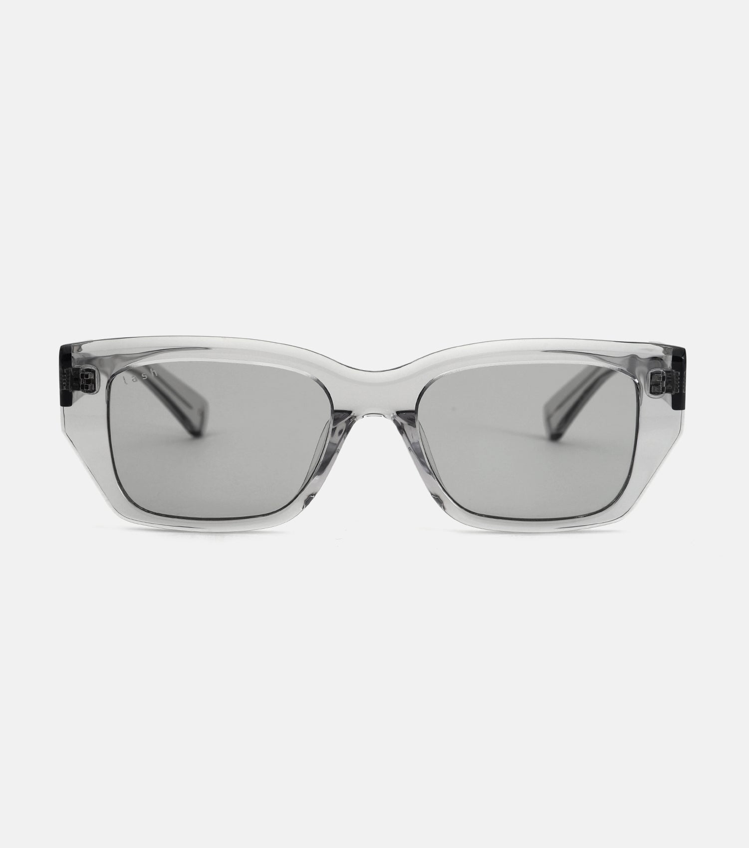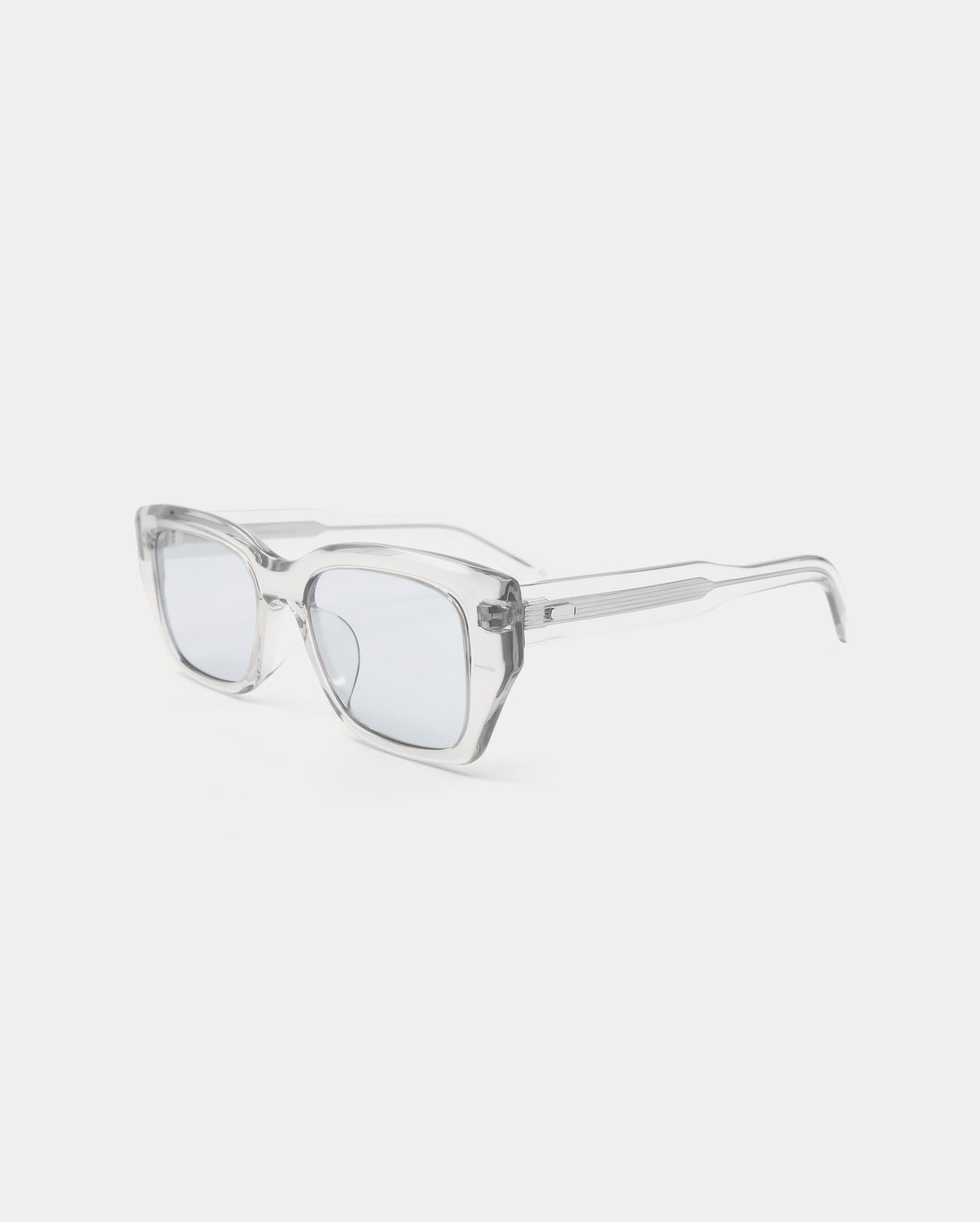 Square acetate sunglass frame. It features an overall bold and massing shape. The flat front is balanced with the various curved exterior angles. It creates a retro mood.