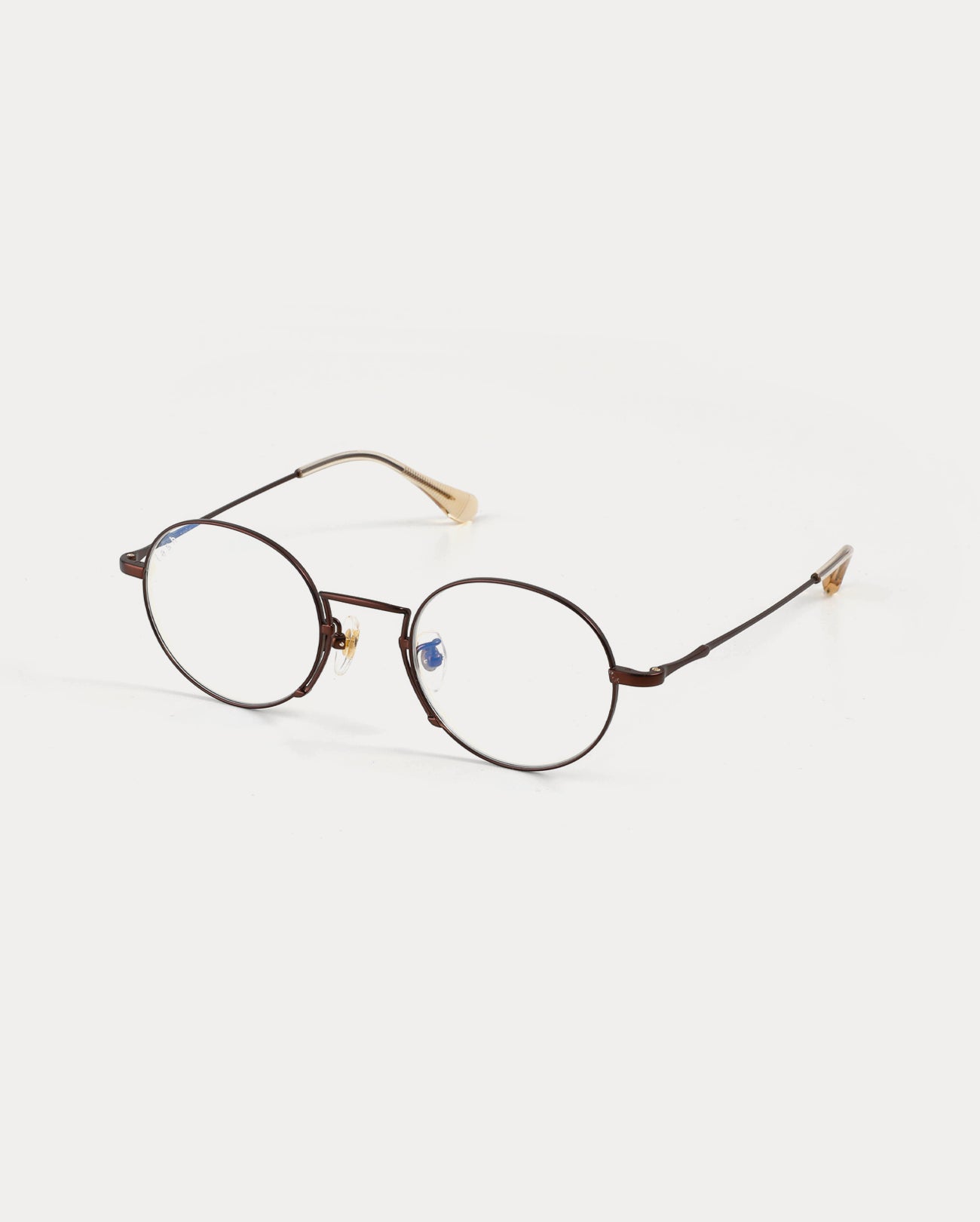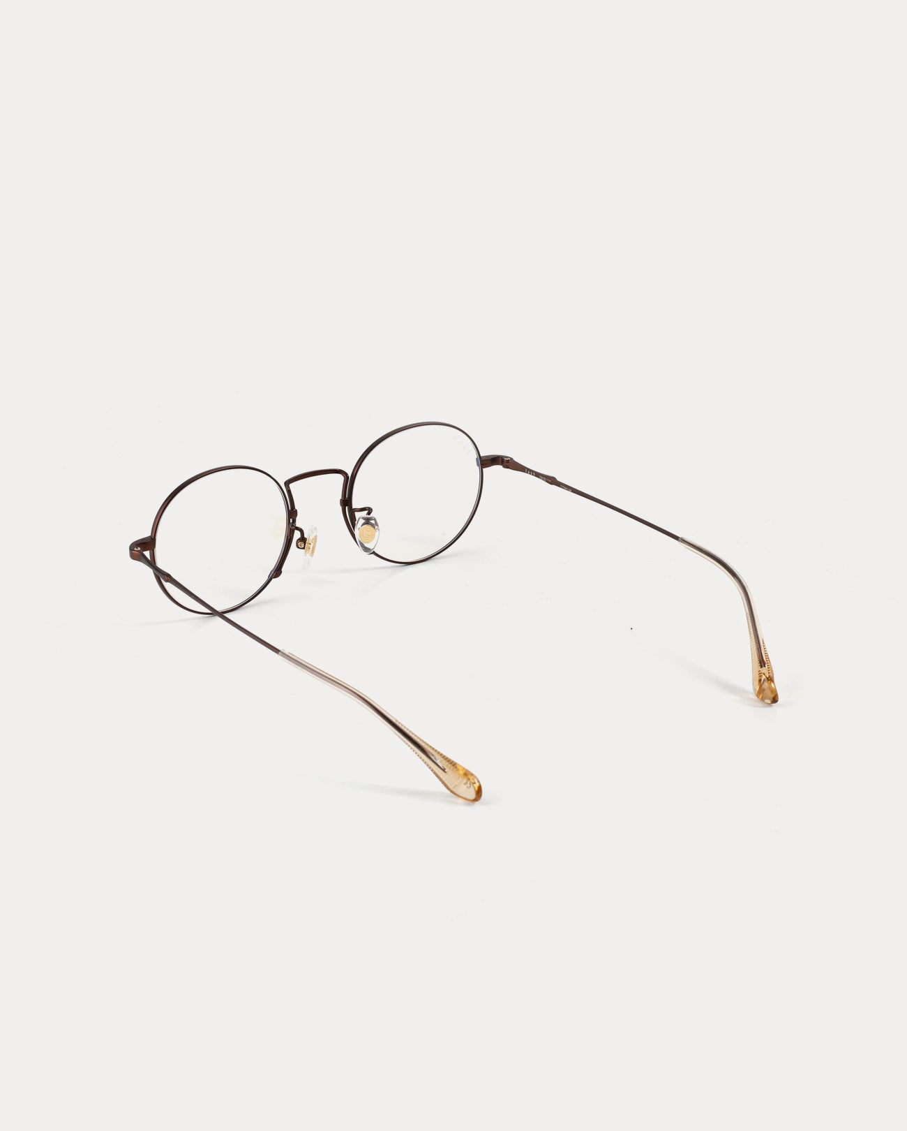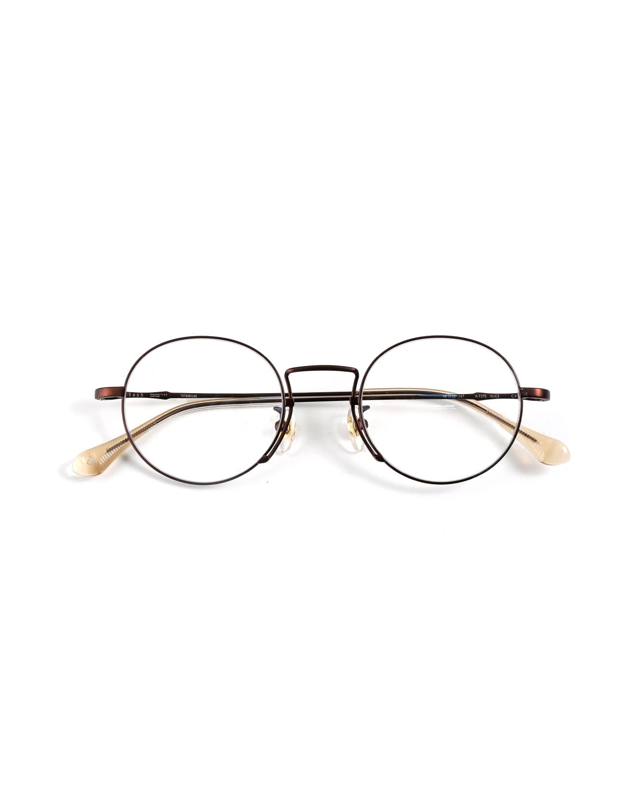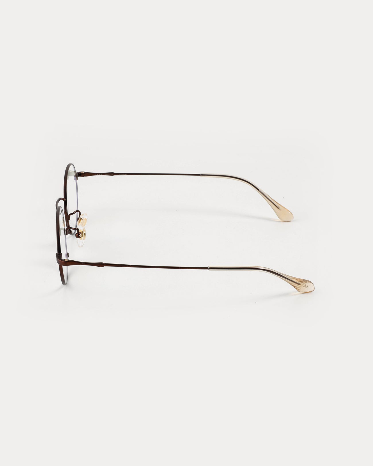 Round titanium optical frame. The front and temples are made of titanium. It features thin lines and lightness, comfortable fitting, and excellent durability. The uniquely structured bridge creates a sleek silhouette.