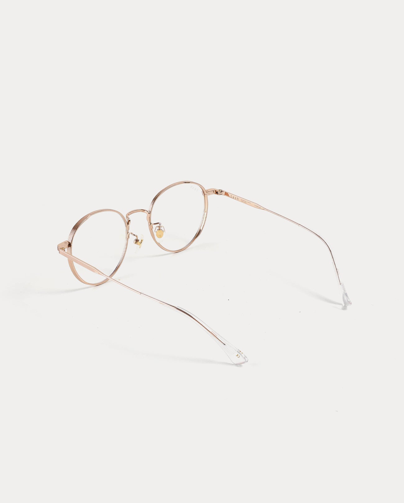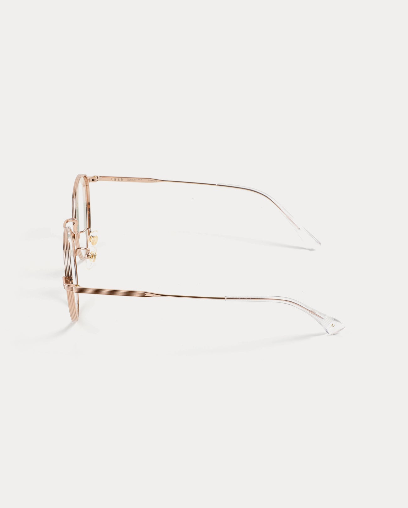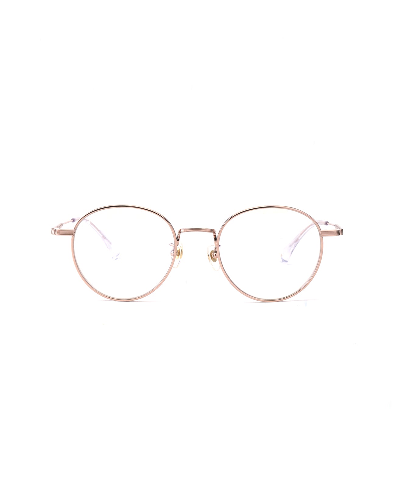 Round metal optical frame. The line details applied to the bridge, rim, end piece, and temple are uniform and make the product stand out. The engraved line details applied to the bridge, rims, end piece, and temple are uniform and make the product stand out. The voluminous temple tip balances the weight to provide comfort fitting.
