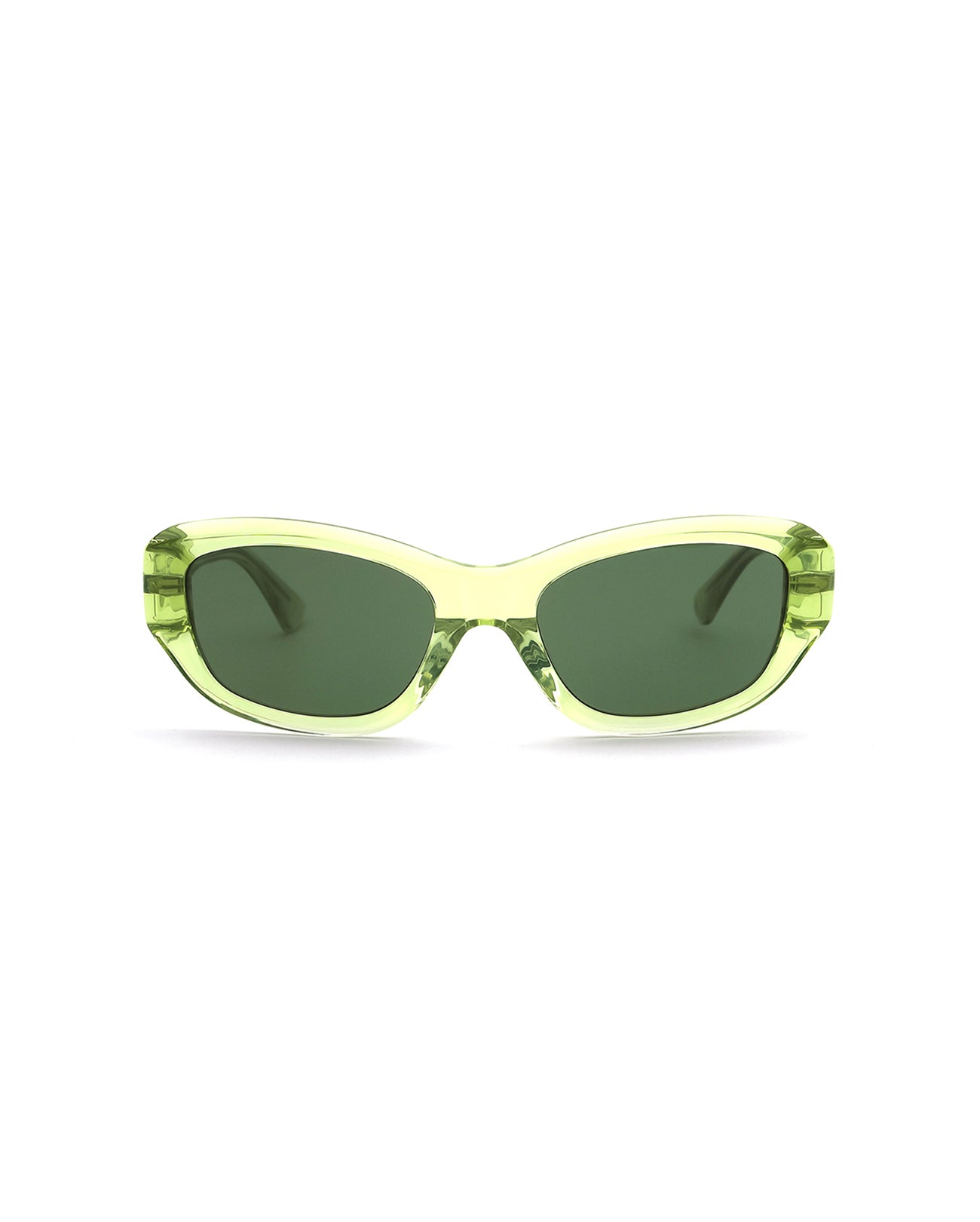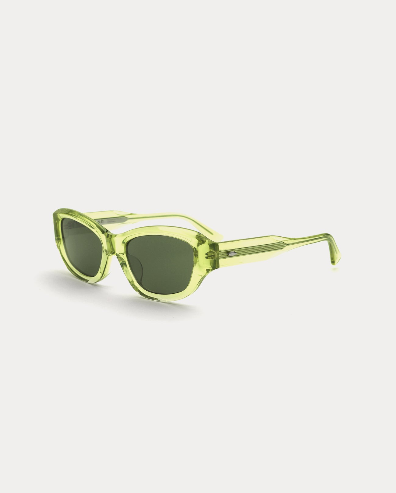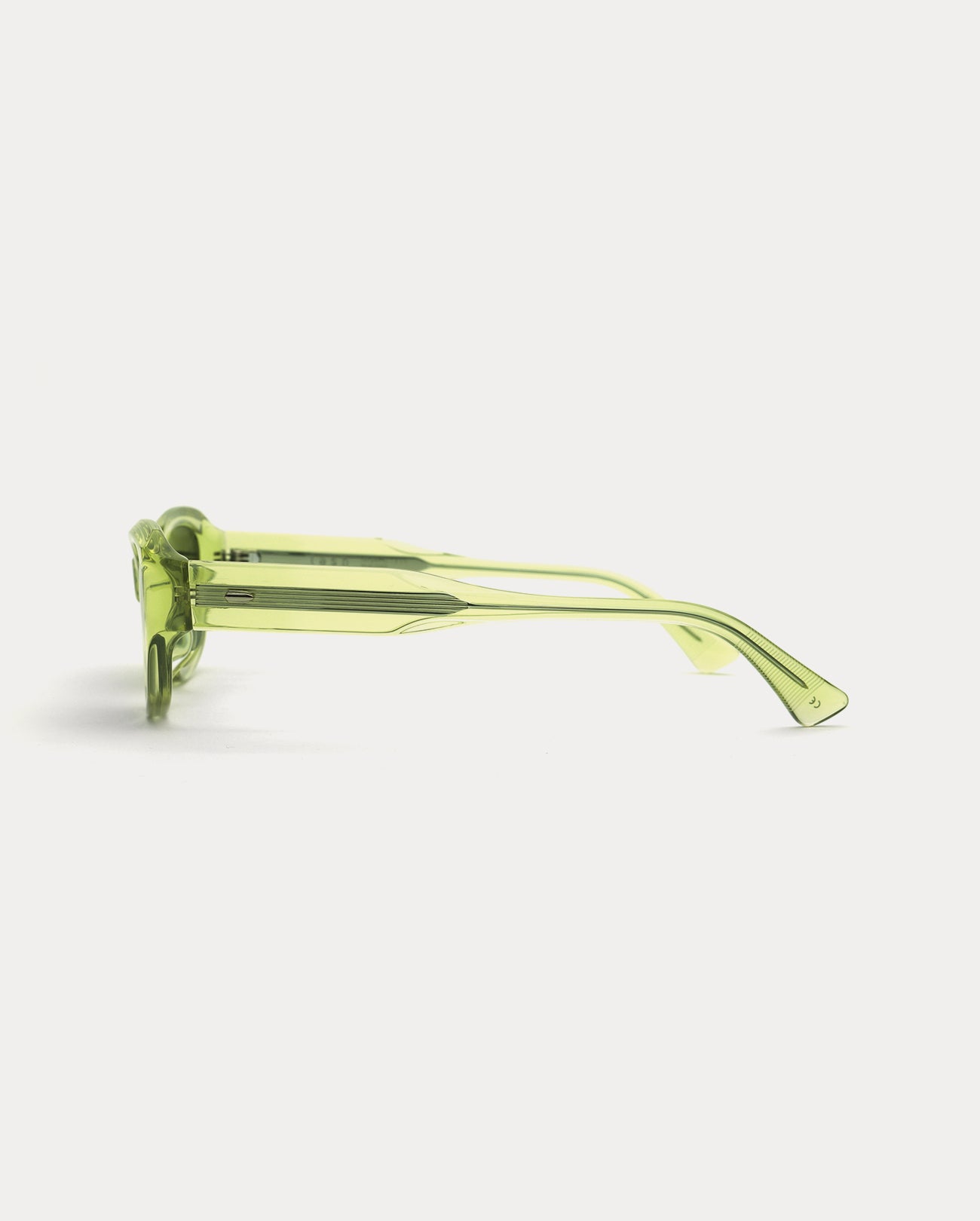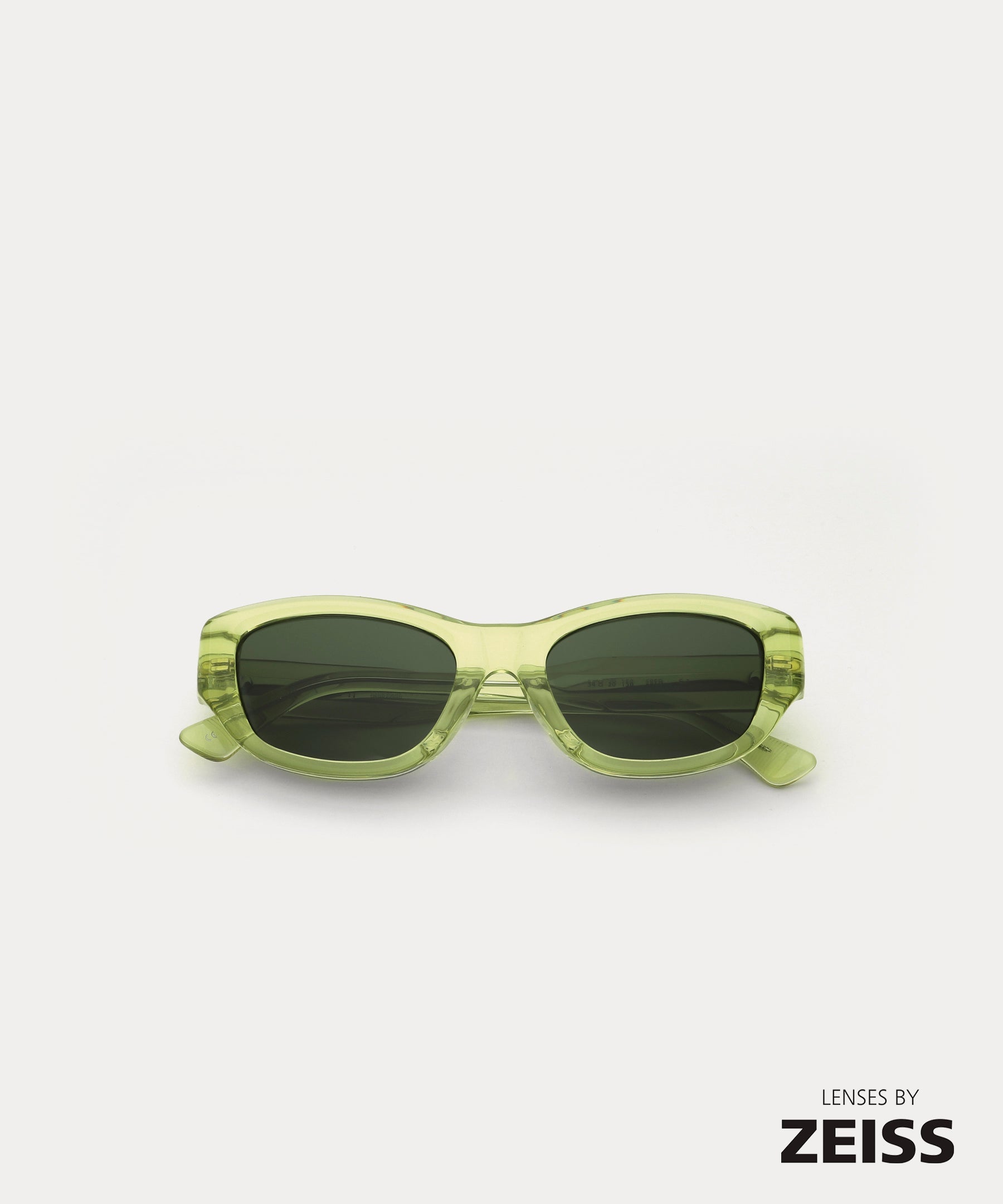 Square acetate Sunglass frame. The front curve is designed to be round, and the upper line and the lens part are designed sophisticatedly. In addition, its overall bold shape gives a strong impression.