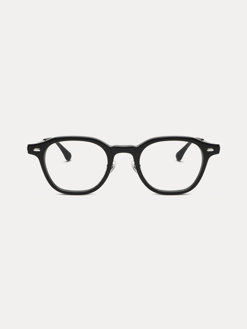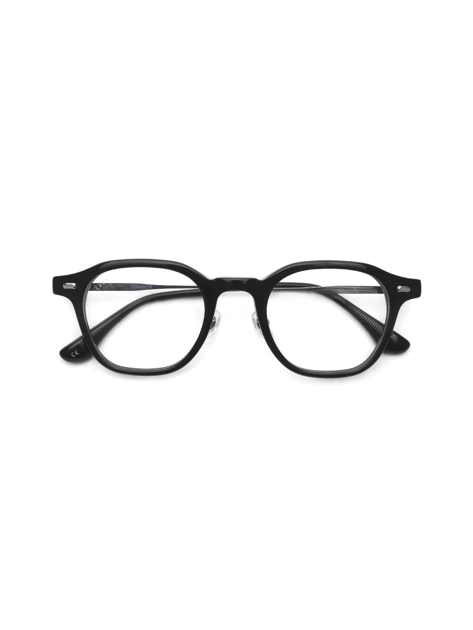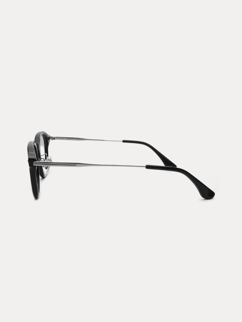 The front is acetate, while the temples feature a titanium structure with integrated tips. The upper rim's shape resembles a crown pantos silhouette for a sophisticated look, highlighted by subtle metal accents on the front and titanium detailing.