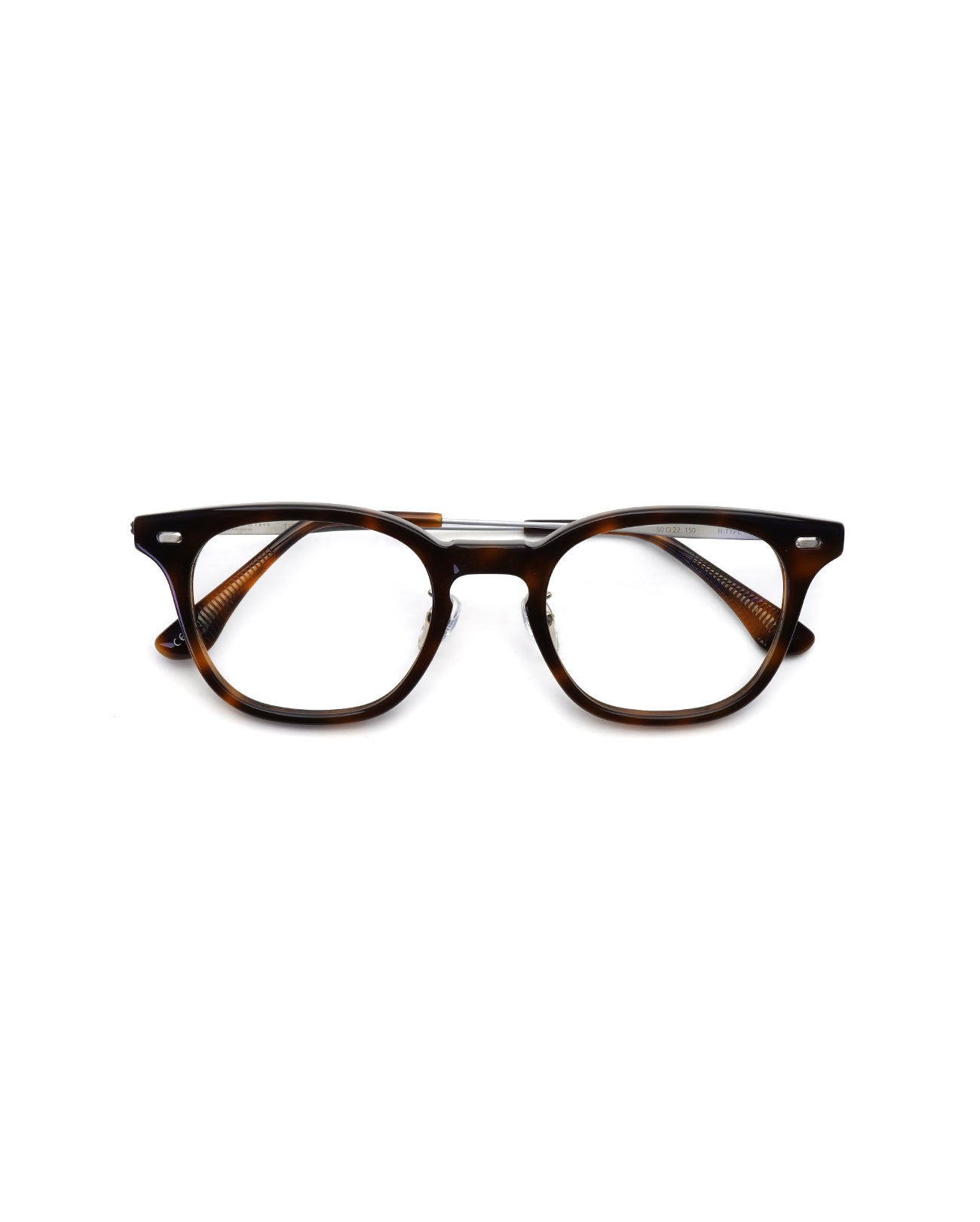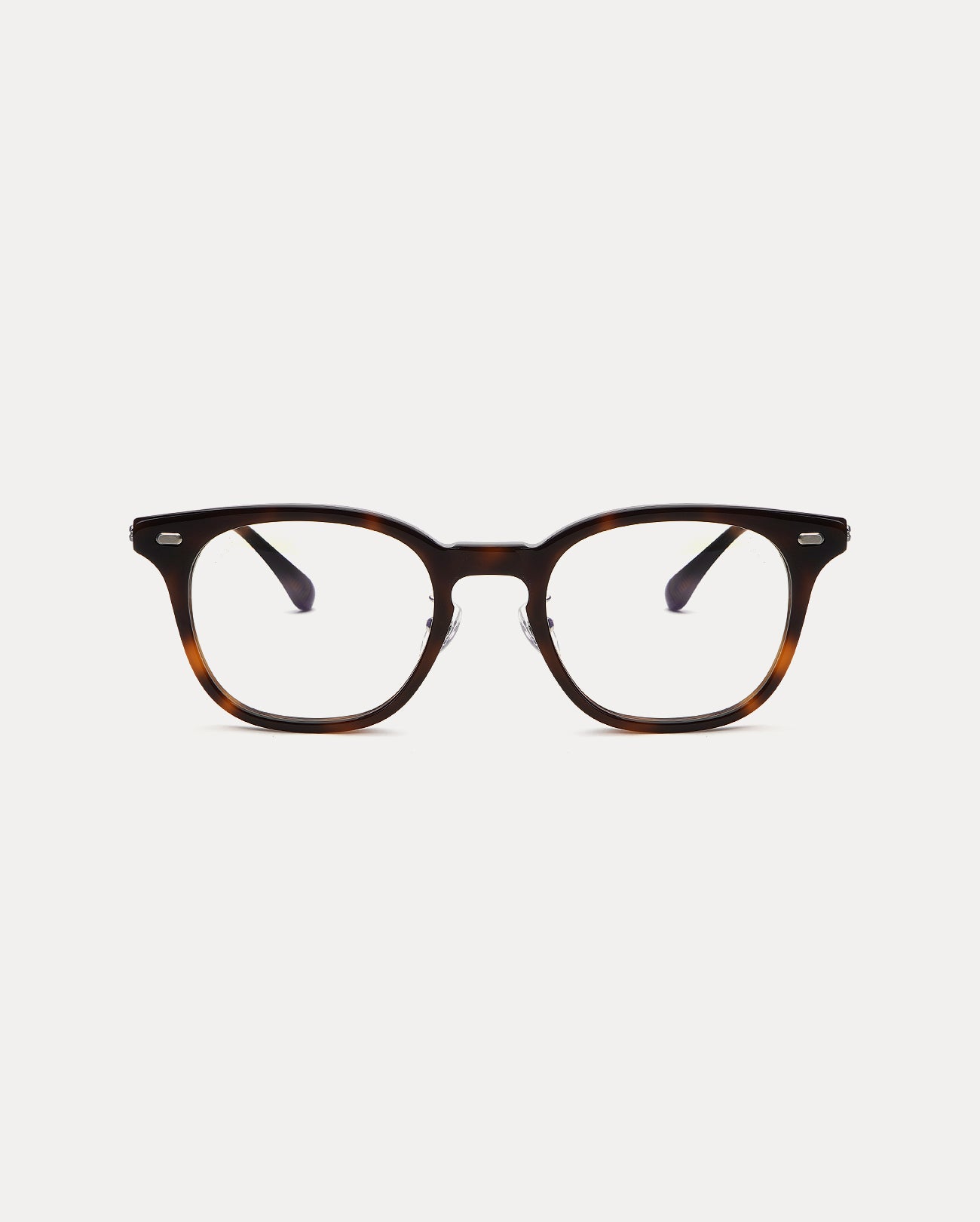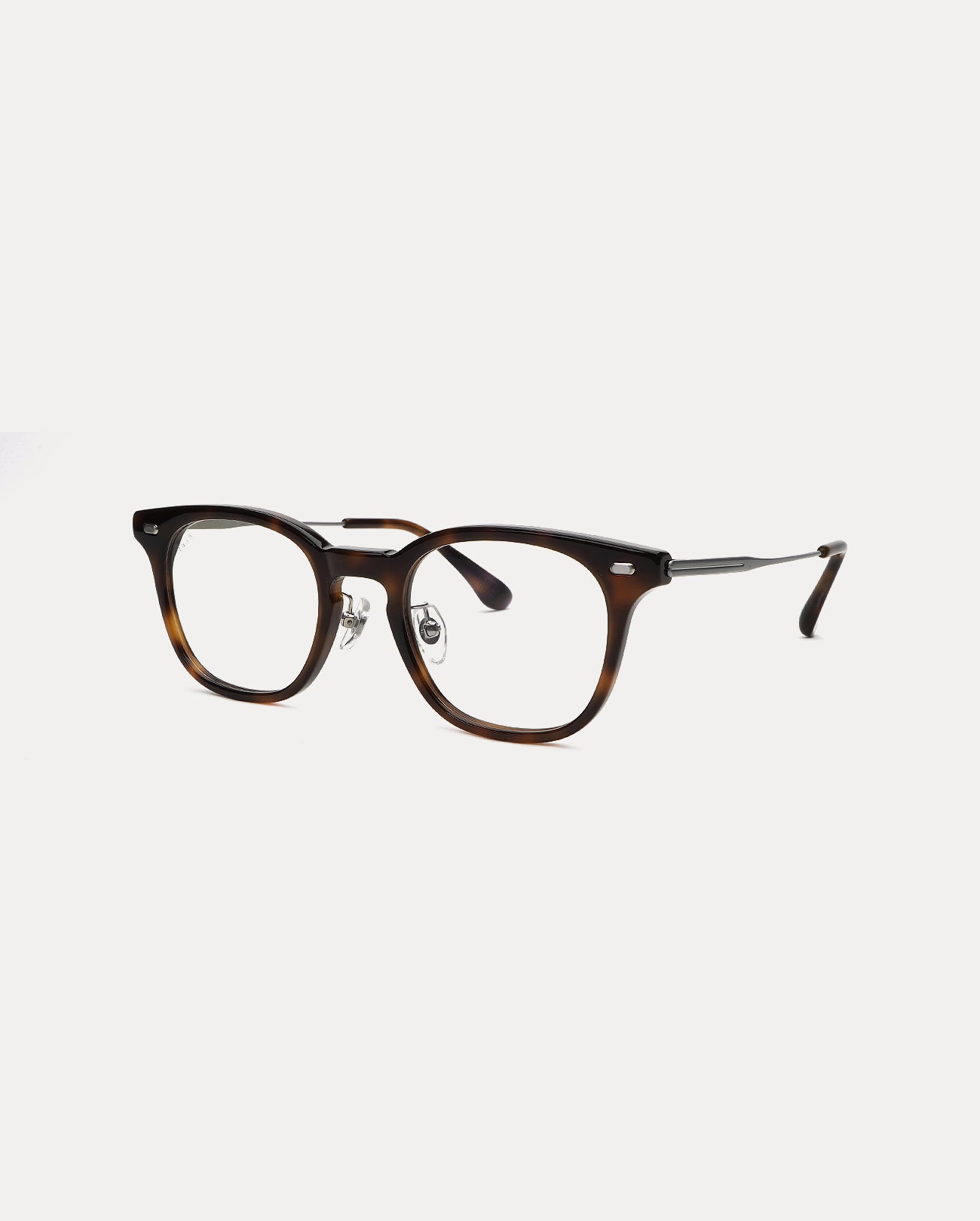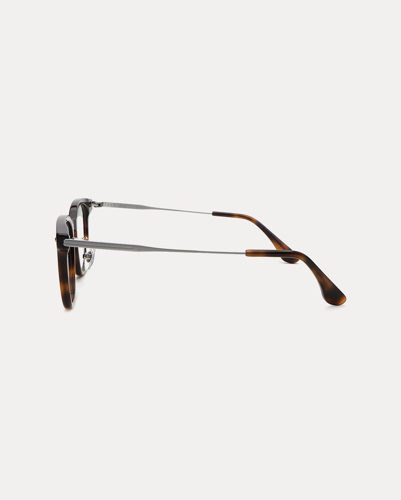 This is a square-shaped combination eyeglass frame. The front is acetate, while the temples feature a titanium structure with integrated tips.