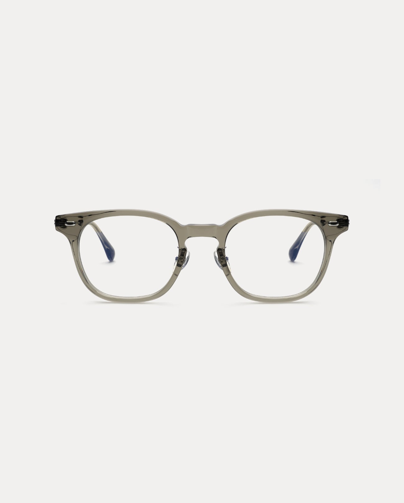 This is a square-shaped combination eyeglass frame. The front is acetate, while the temples feature a titanium structure with integrated tips.