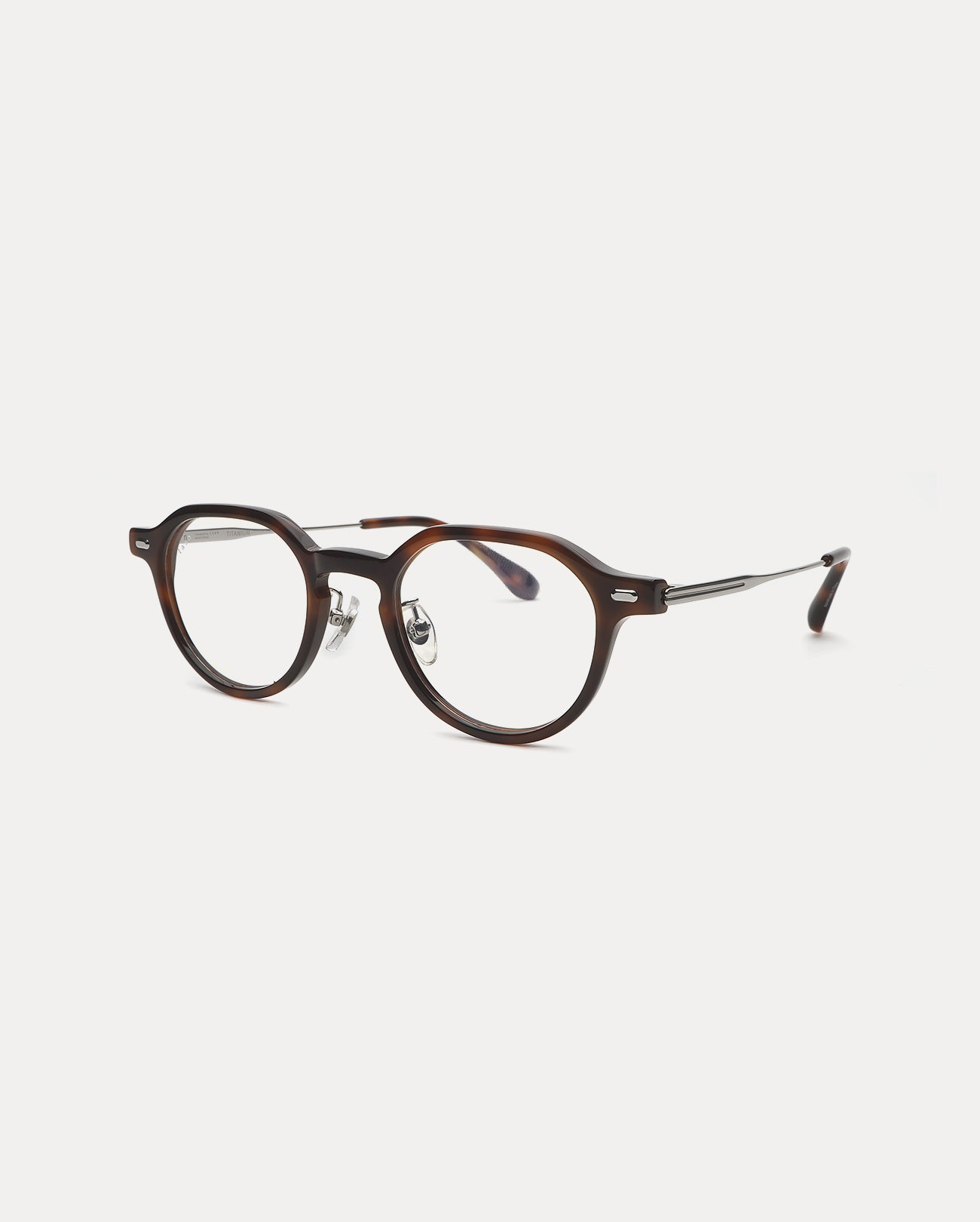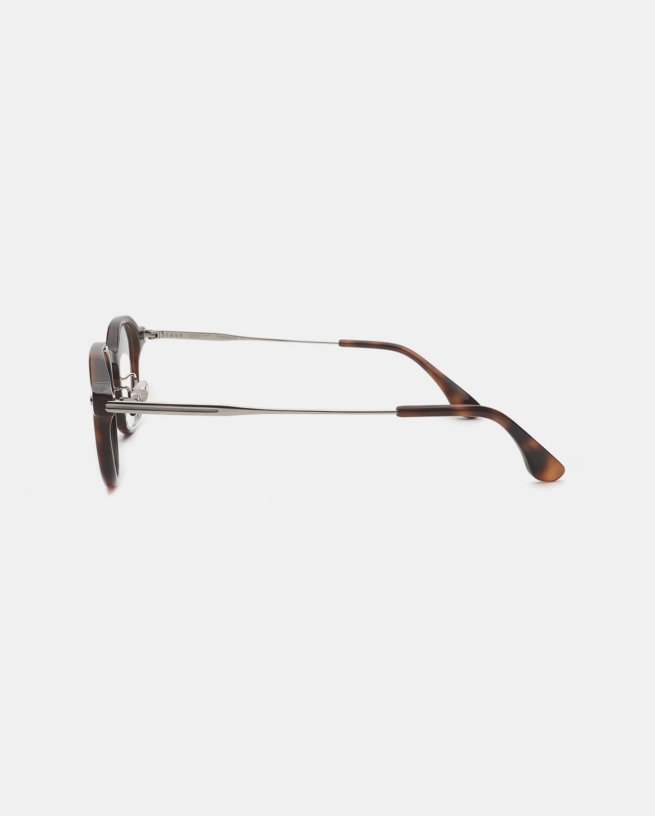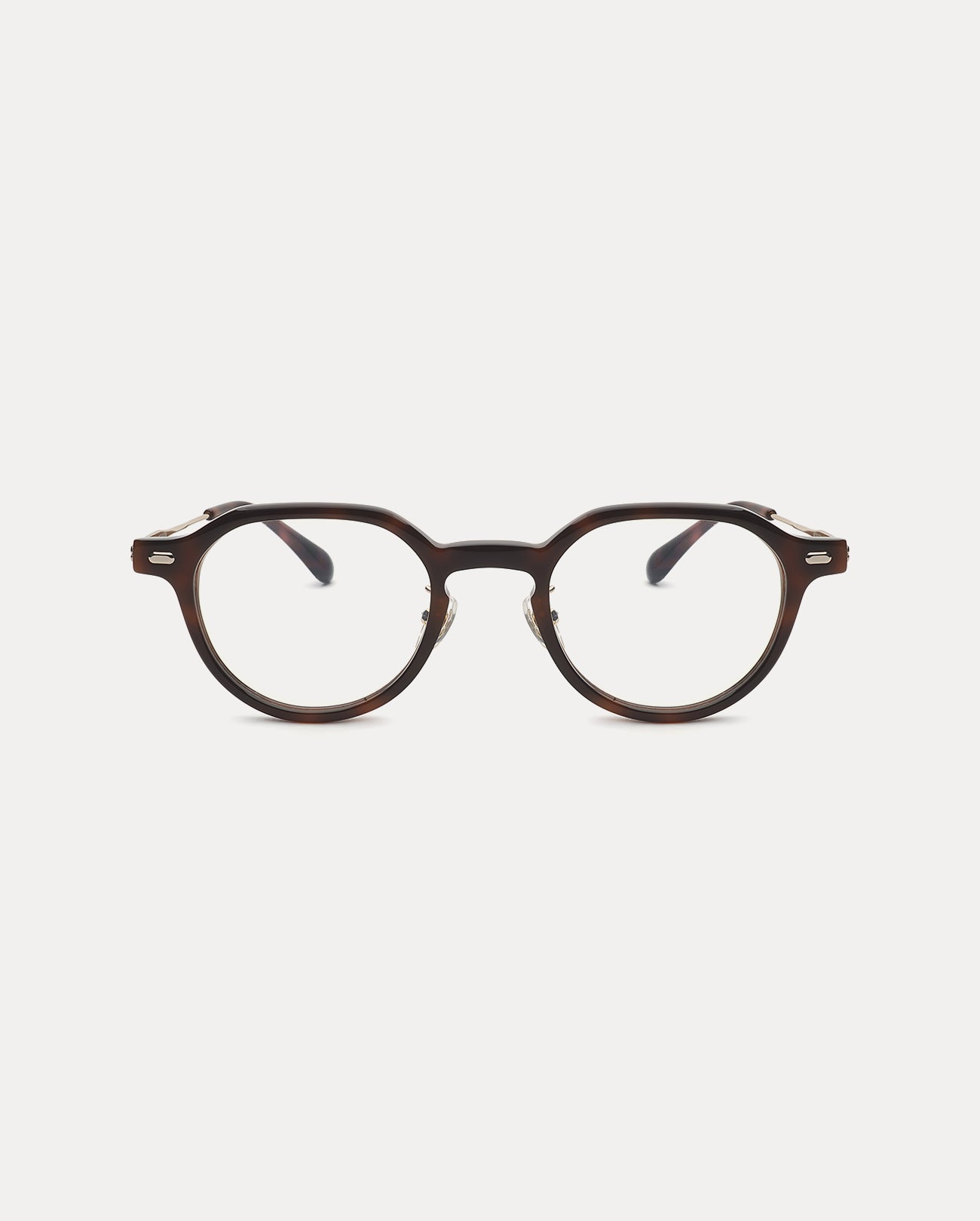 This is a combination frame featuring a crown pantos shape. The front is acetate, while the temples are titanium with integrated tips.