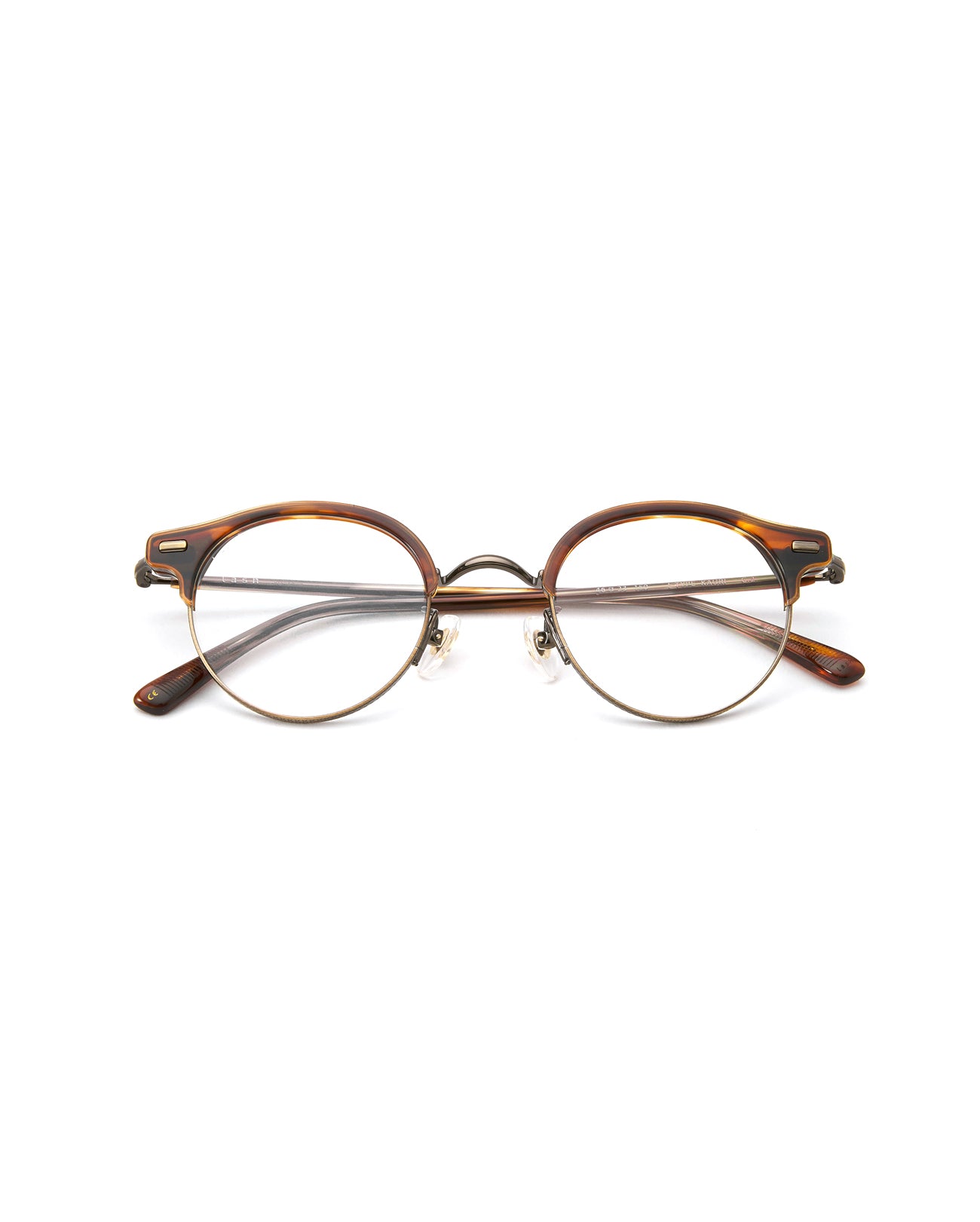Round acetate and metal combination brow line optical frame. The refined edition is made with the minimum thickness of acetate (4mm), which gives a light and comfortable fit. It shows a natural silhouette with Refined Edition's unique endpiece design that falls softly and flexibly from the end of the frame. It features the signature engraving detail on the metal rim.