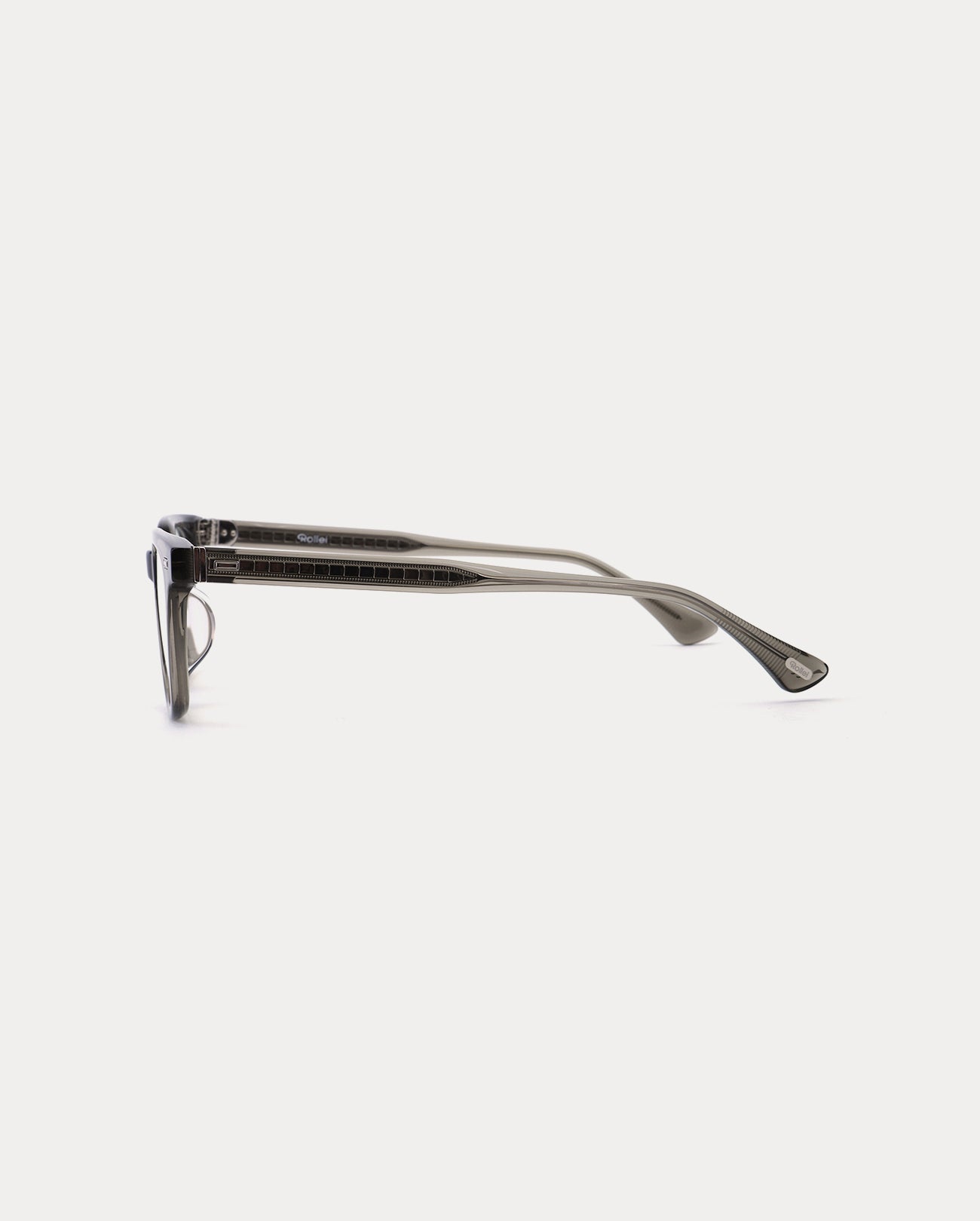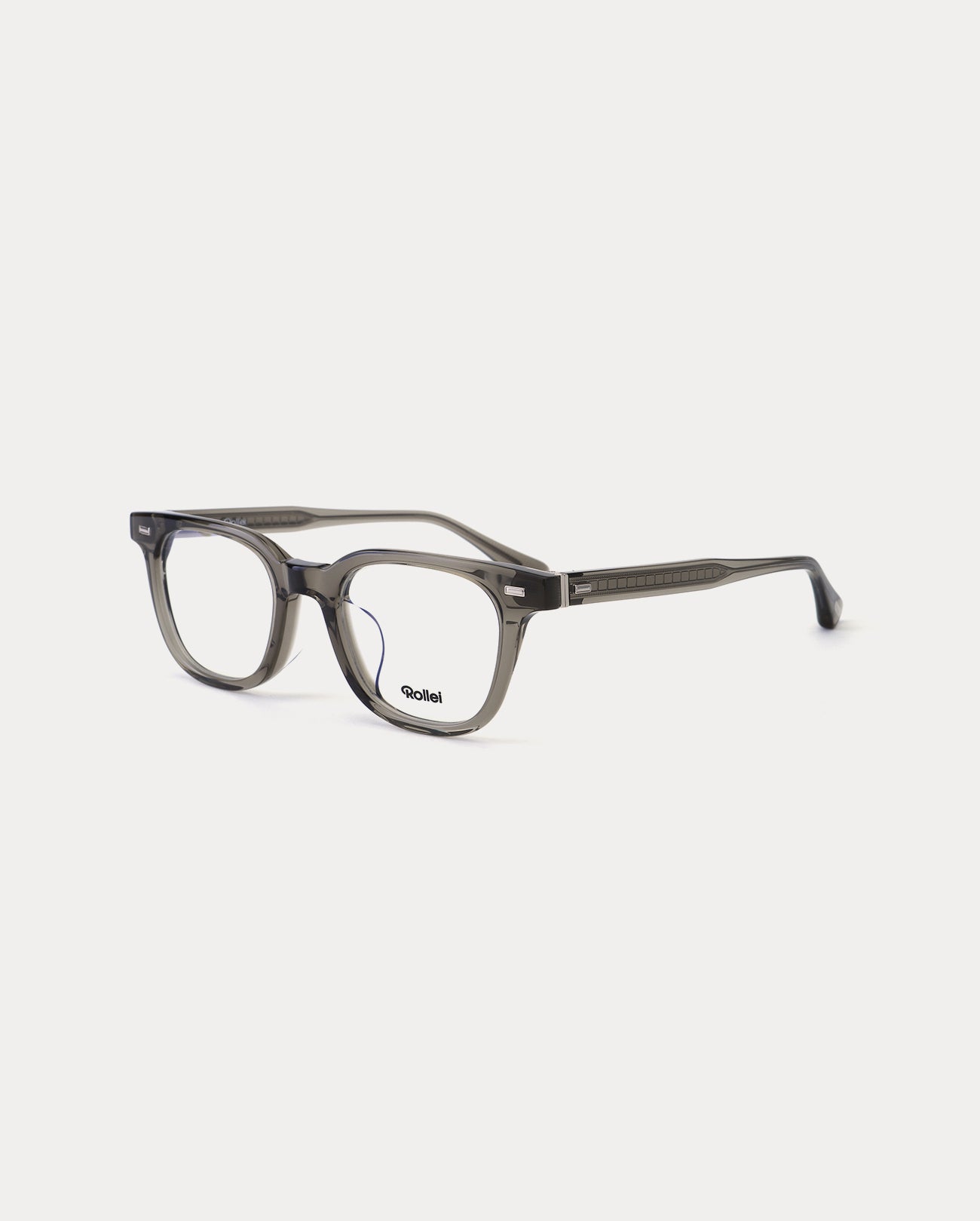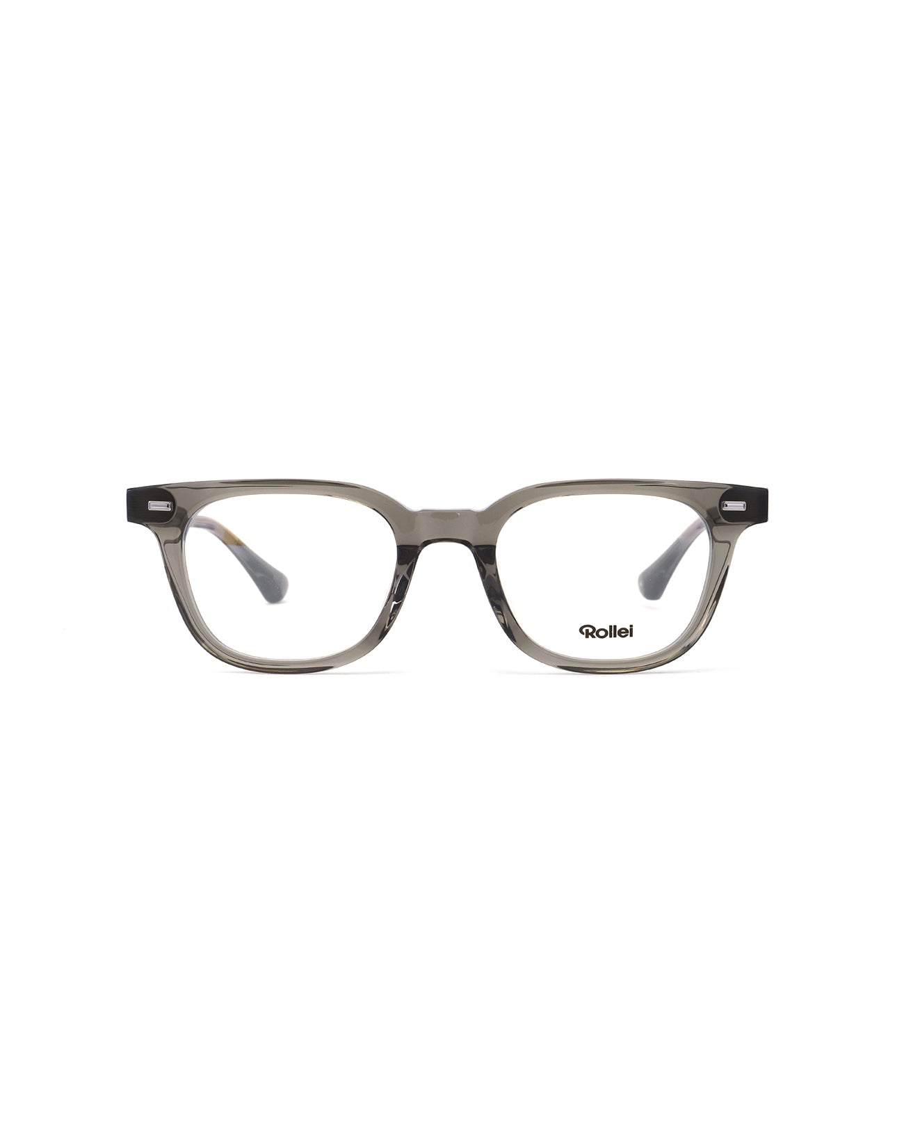 Full acetate eyeglass frames with a square shape base. The narrow vertical width and long horizontal shape of the lenses, straight endpieces and straight lines create a sleek silhouette for a sophisticated look. The Rollei camera features are incorporated into the details throughout the product to make it a complete product.