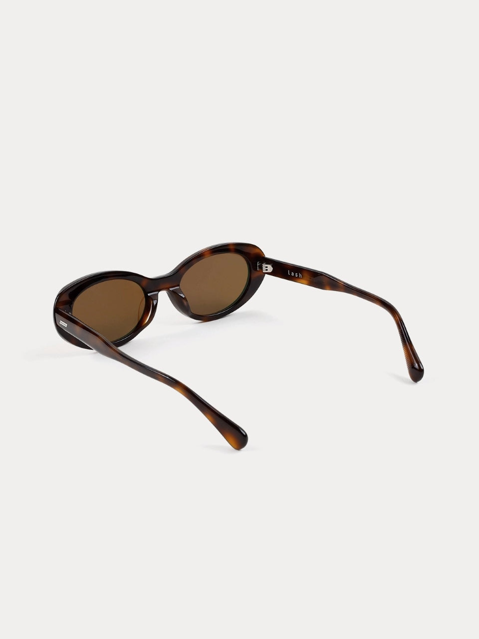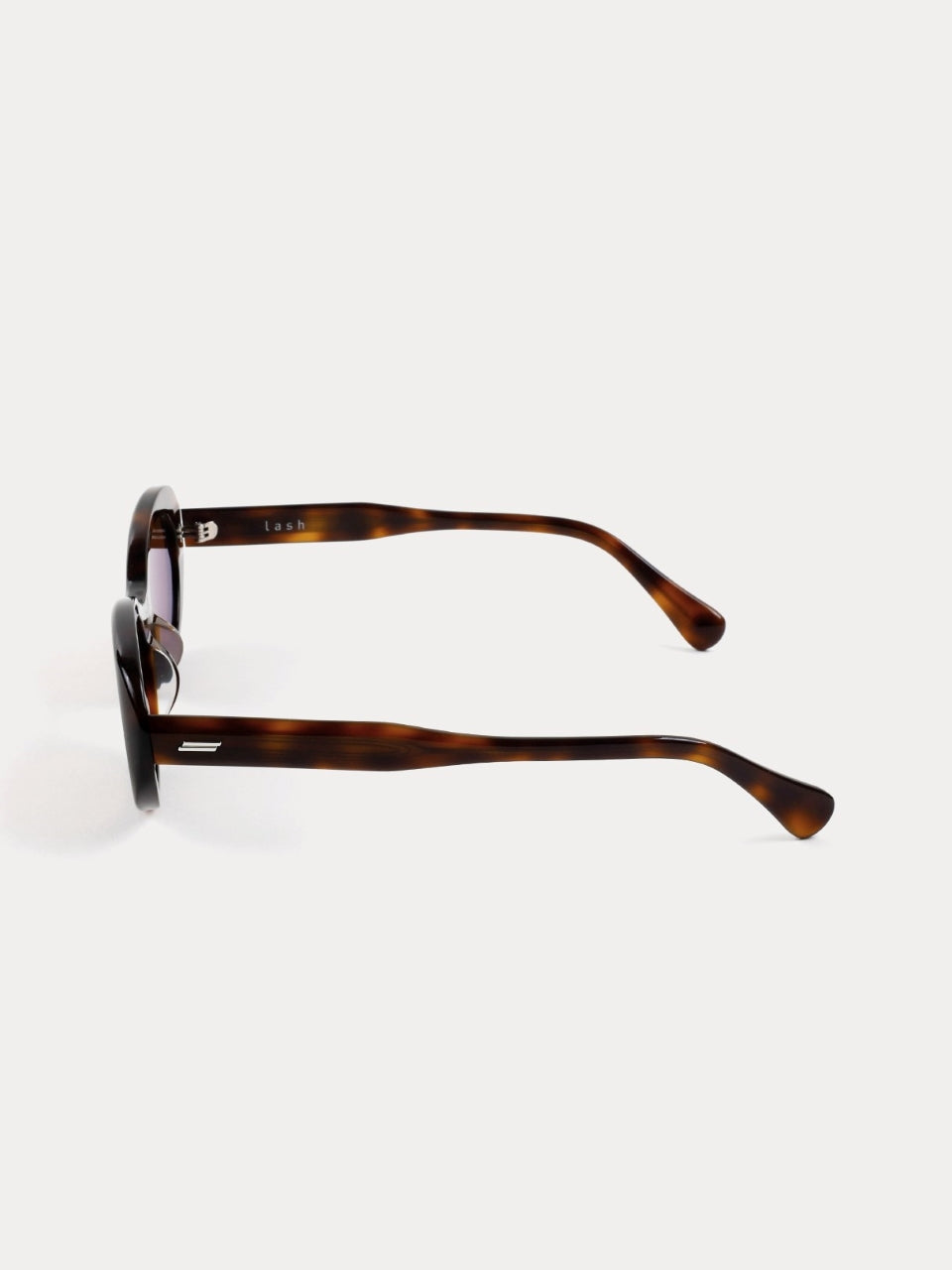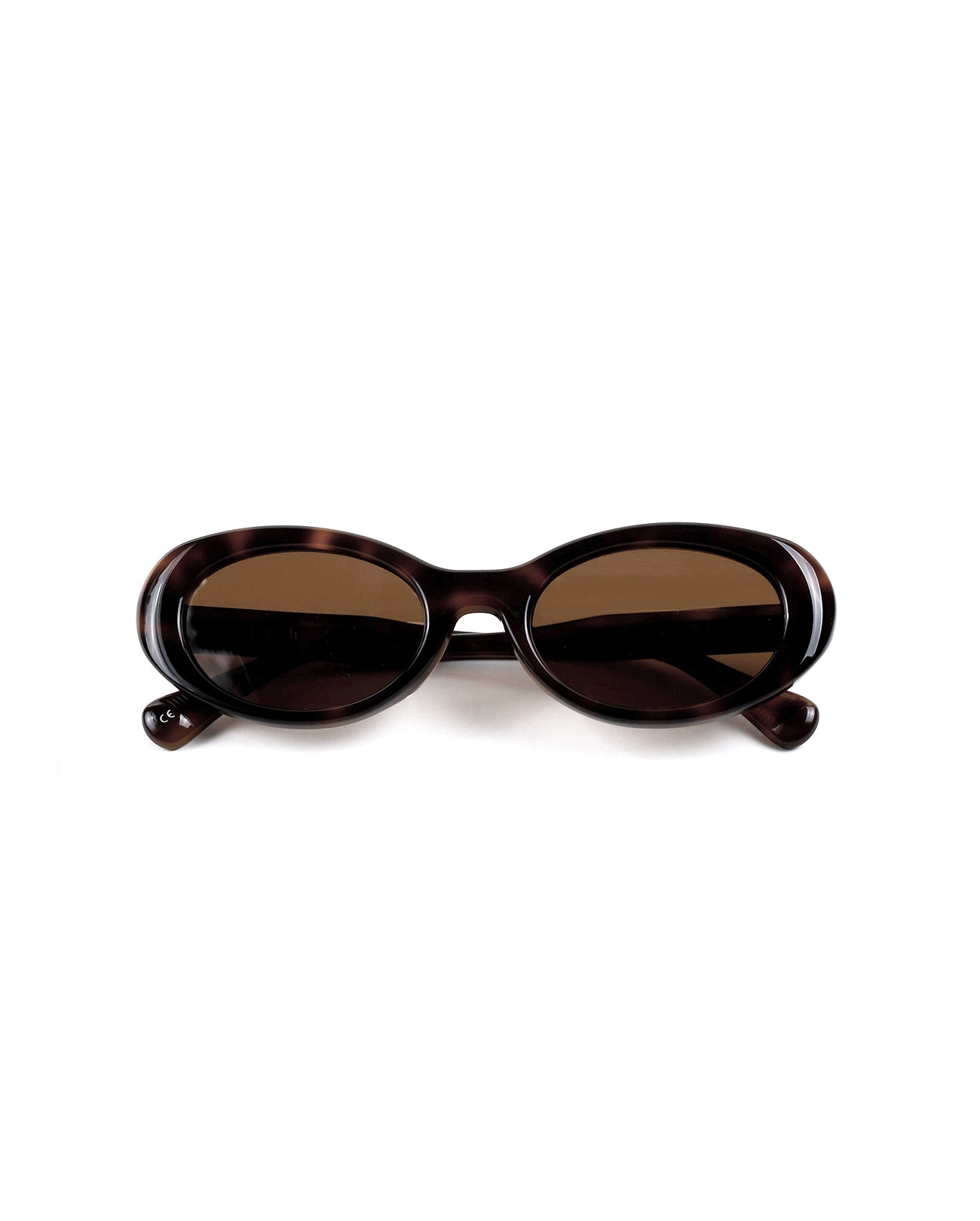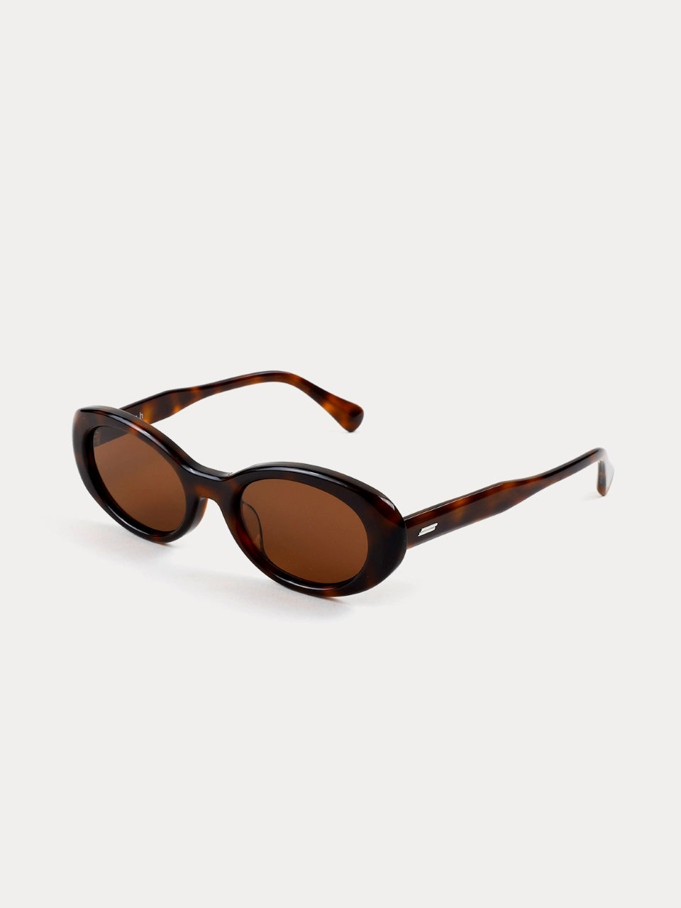 Full acetate sunglasses with a round shape base. The oval-shaped lenses and gently curved sides create a trendy style. They are embellished with metal hardware joined at the temples.