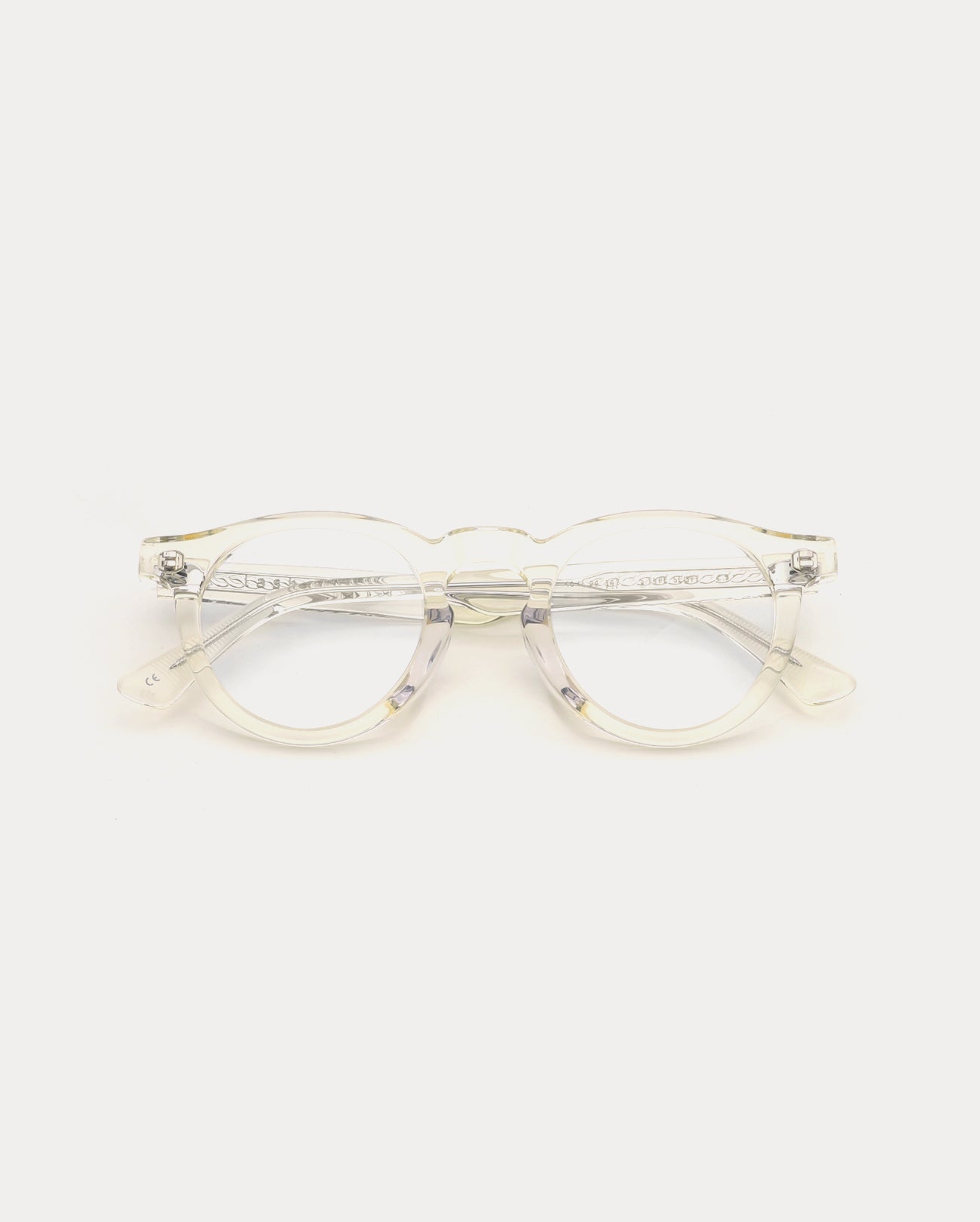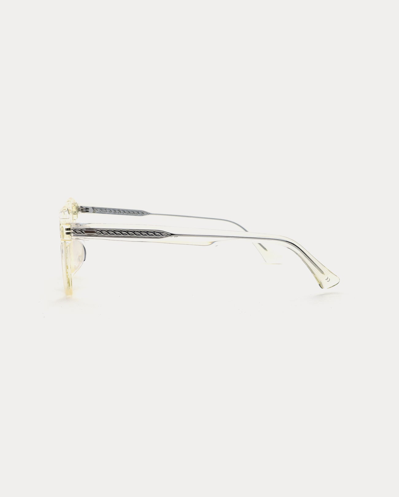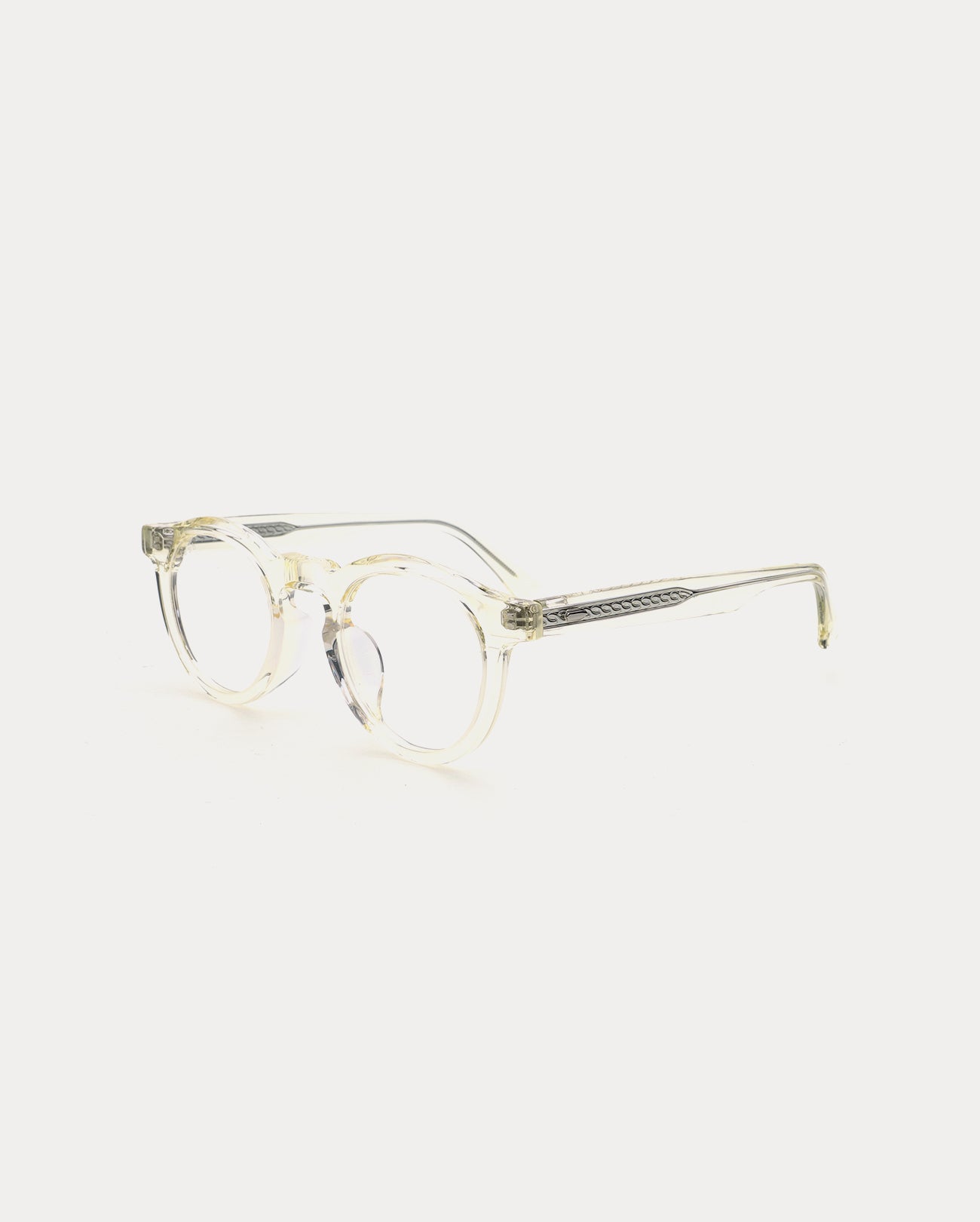 Round acetate optical frame. The acetate from Mazzucchelli which is applied as the base material for the frame shows luxurious color and luster. The front design without rivets presents a minimal look. Moderate thickness and the edges of the upper line added sharpness. The metal core patterns reflected on the temples make the product more luxurious.