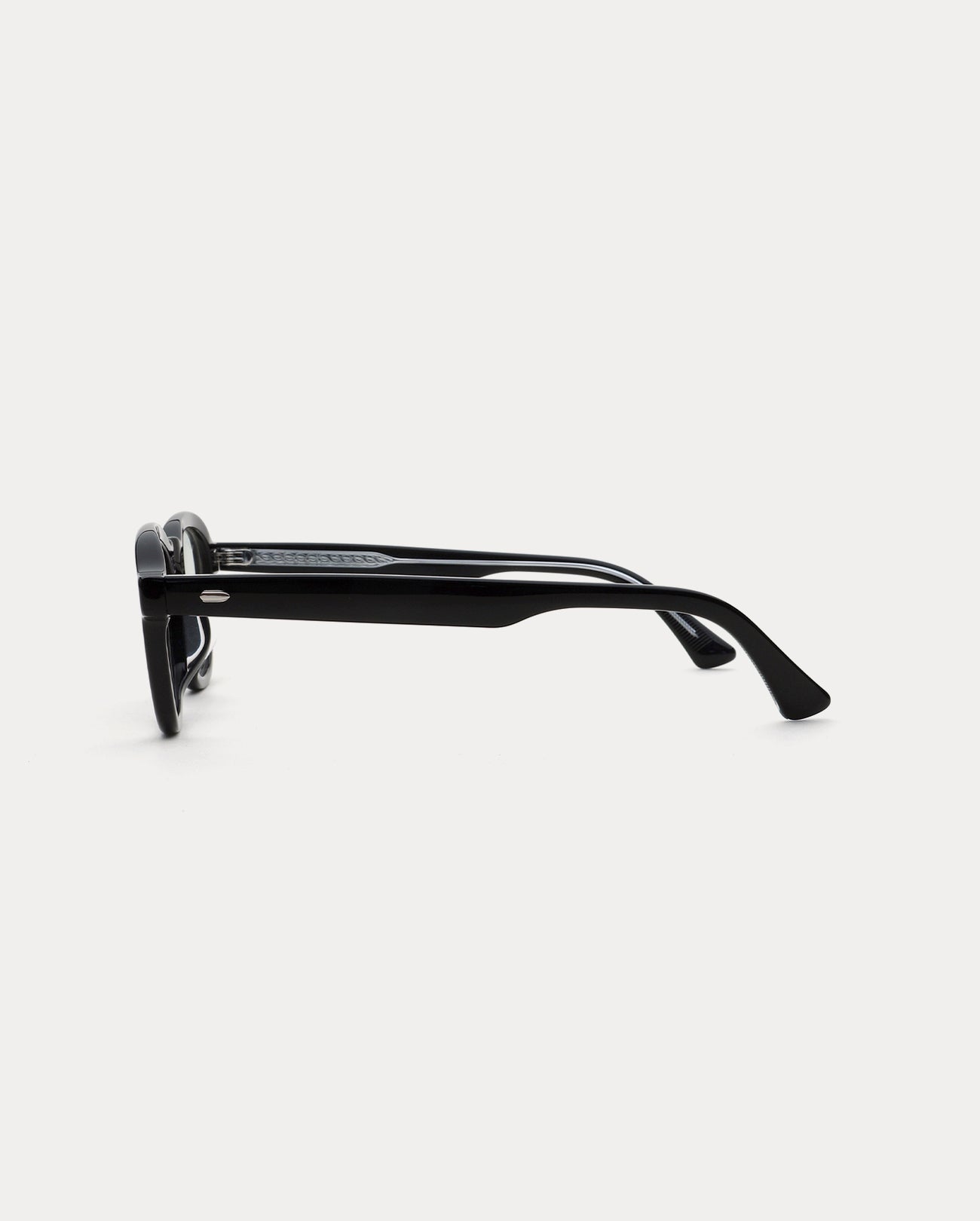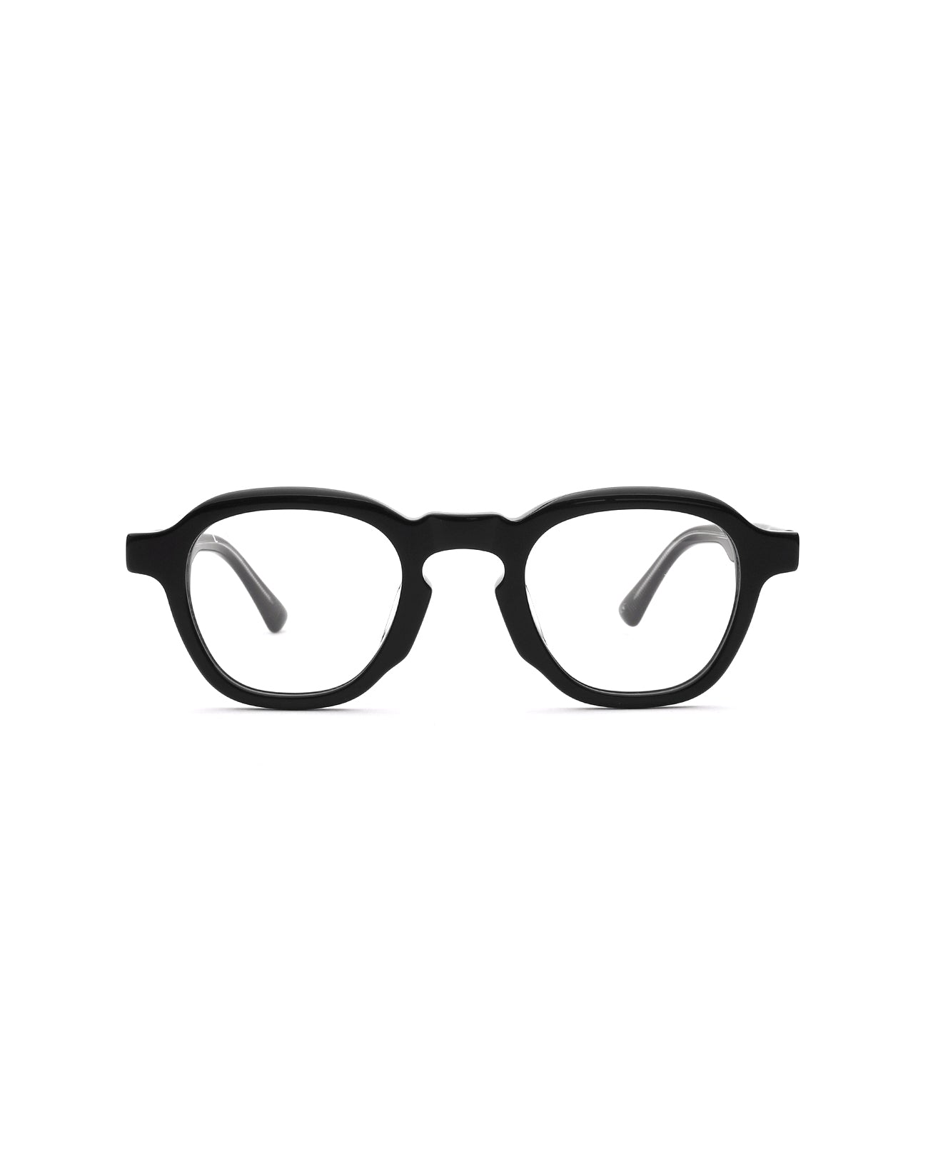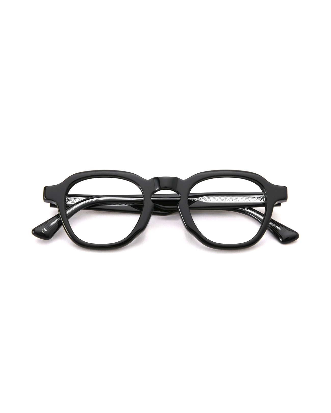 Square acetate optical frame. The acetate from Mazzucchelli which is applied as the base material for the frame shows luxurious color and luster. The front design without rivets presents a minimal look. Moderate thickness, the soft edges of the upper line, and the voluminous keyhole bridge present a soft mood. The metal core patterns reflected on the temples make the product more luxurious.
