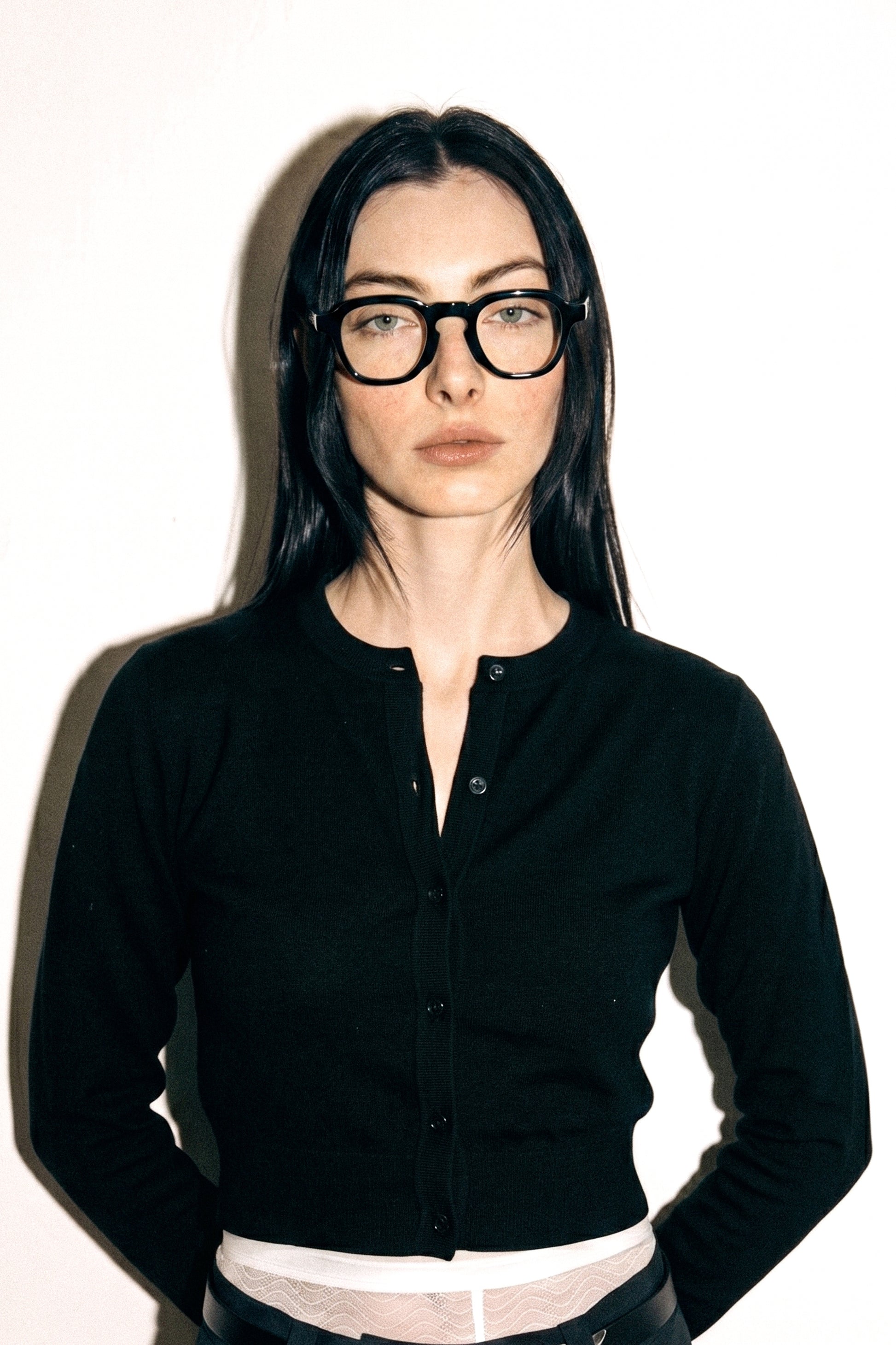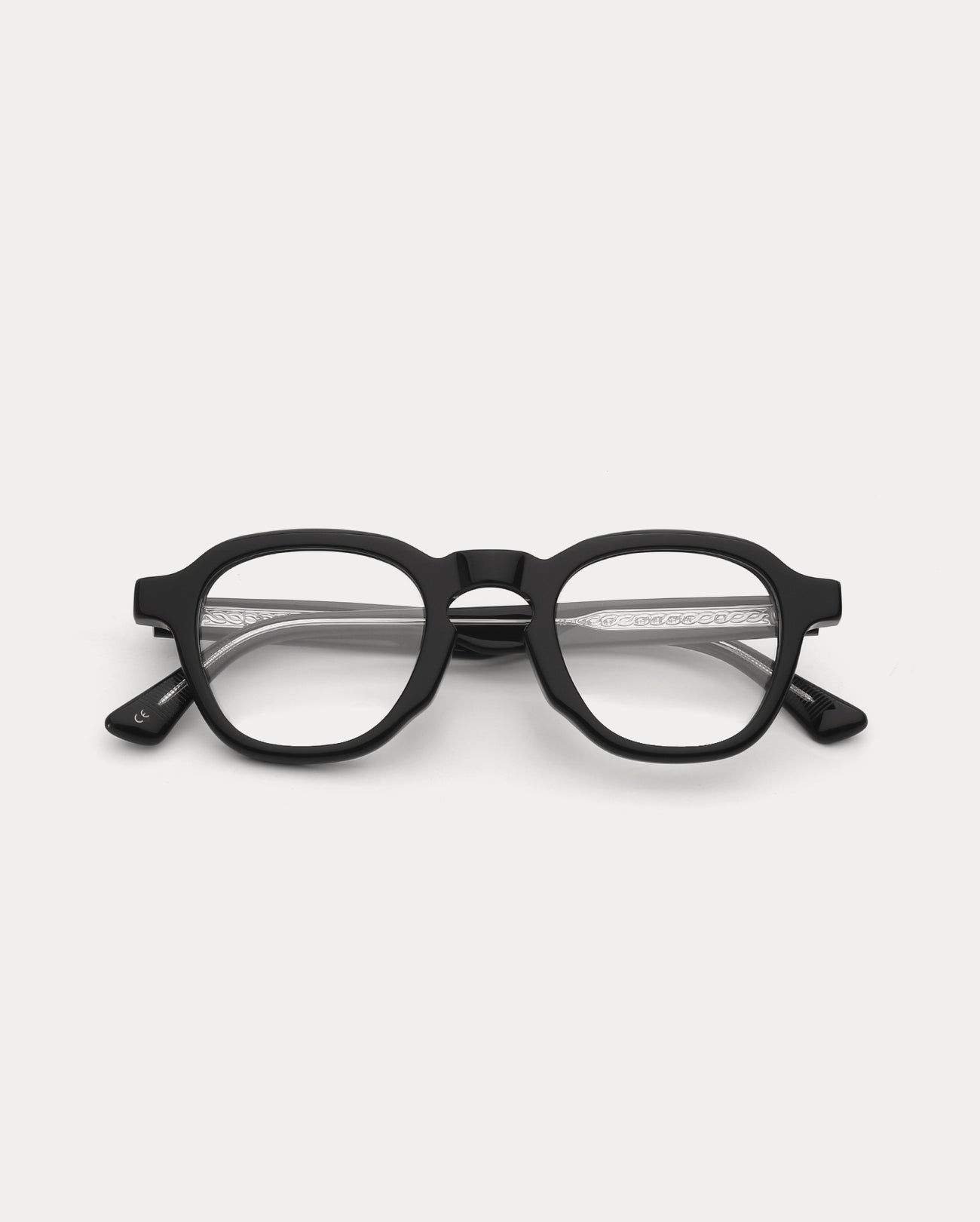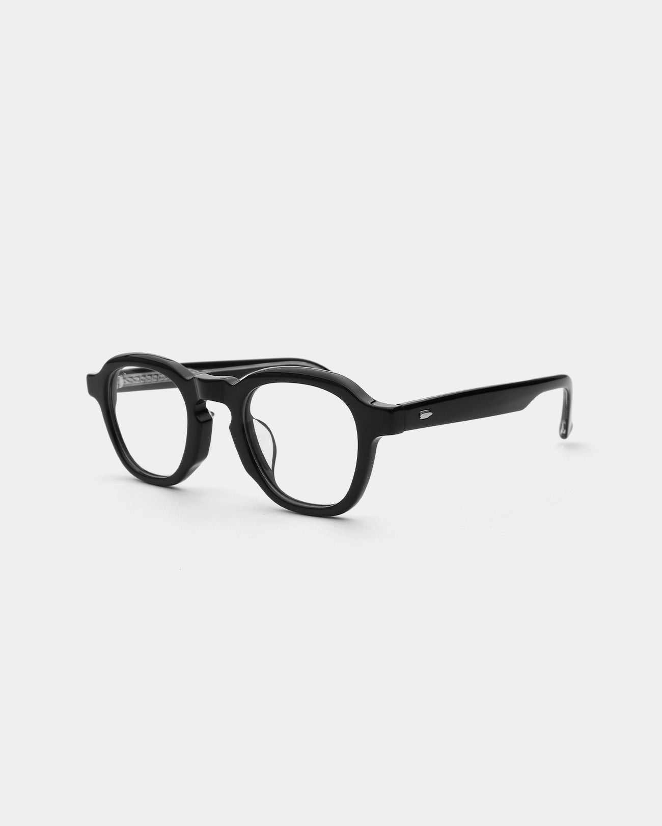 Square acetate optical frame. The acetate from Mazzucchelli which is applied as the base material for the frame shows luxurious color and luster. The front design without rivets presents a minimal look. Moderate thickness, the soft edges of the upper line, and the voluminous keyhole bridge present a soft mood. The metal core patterns reflected on the temples make the product more luxurious.