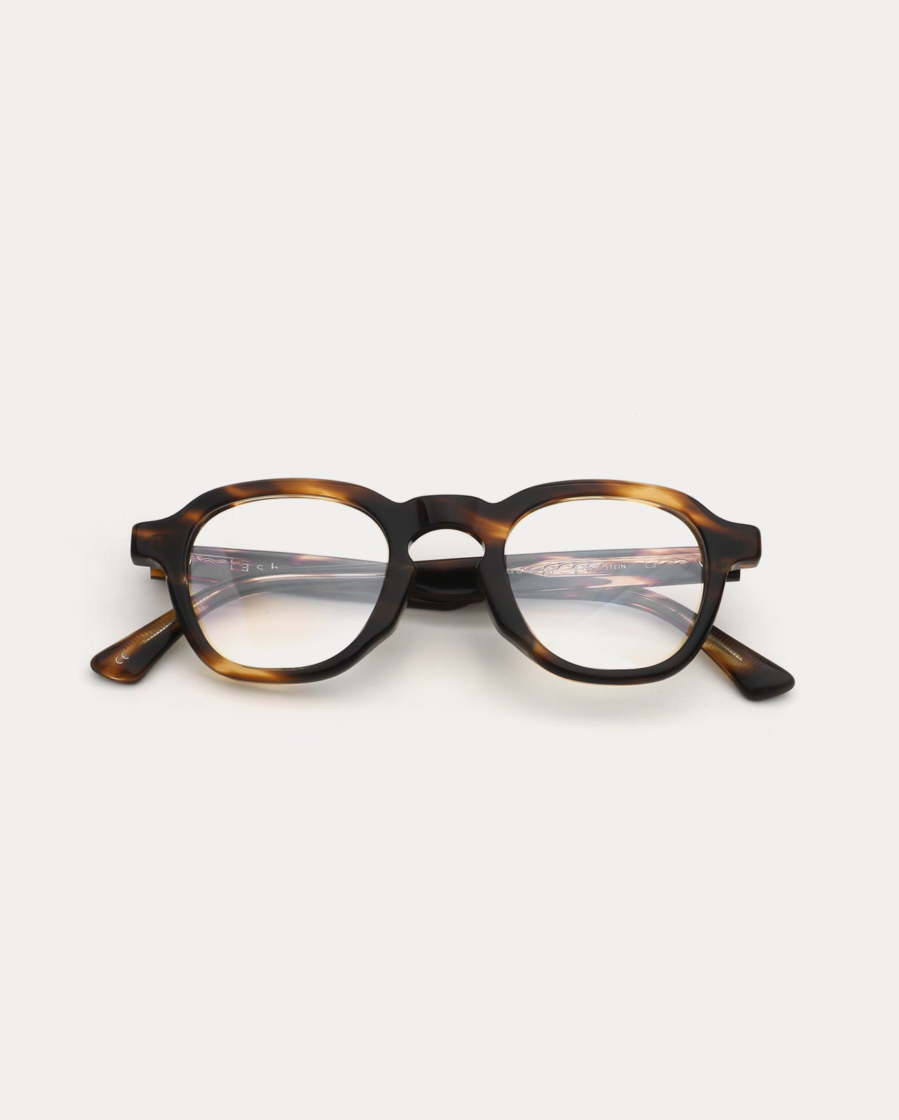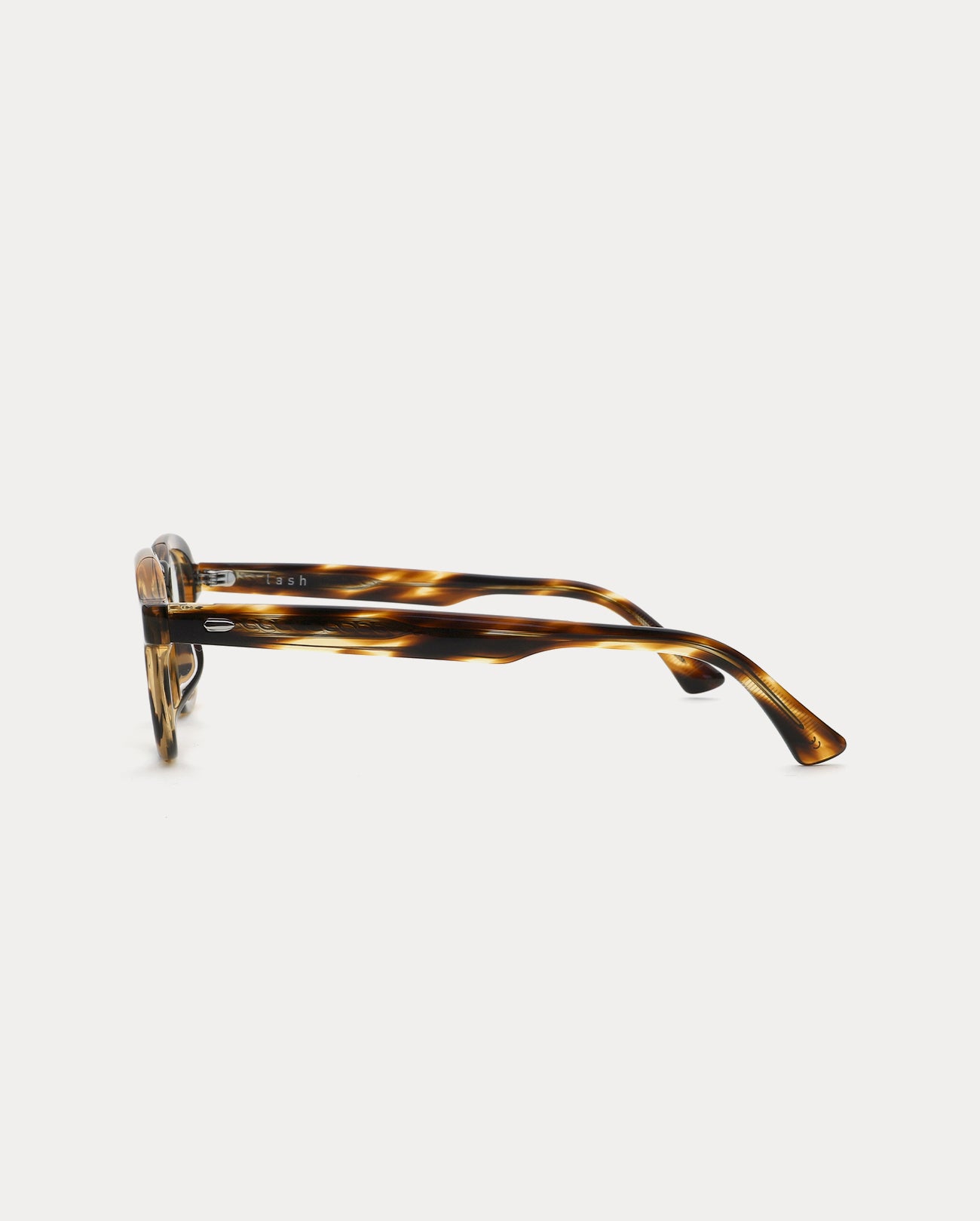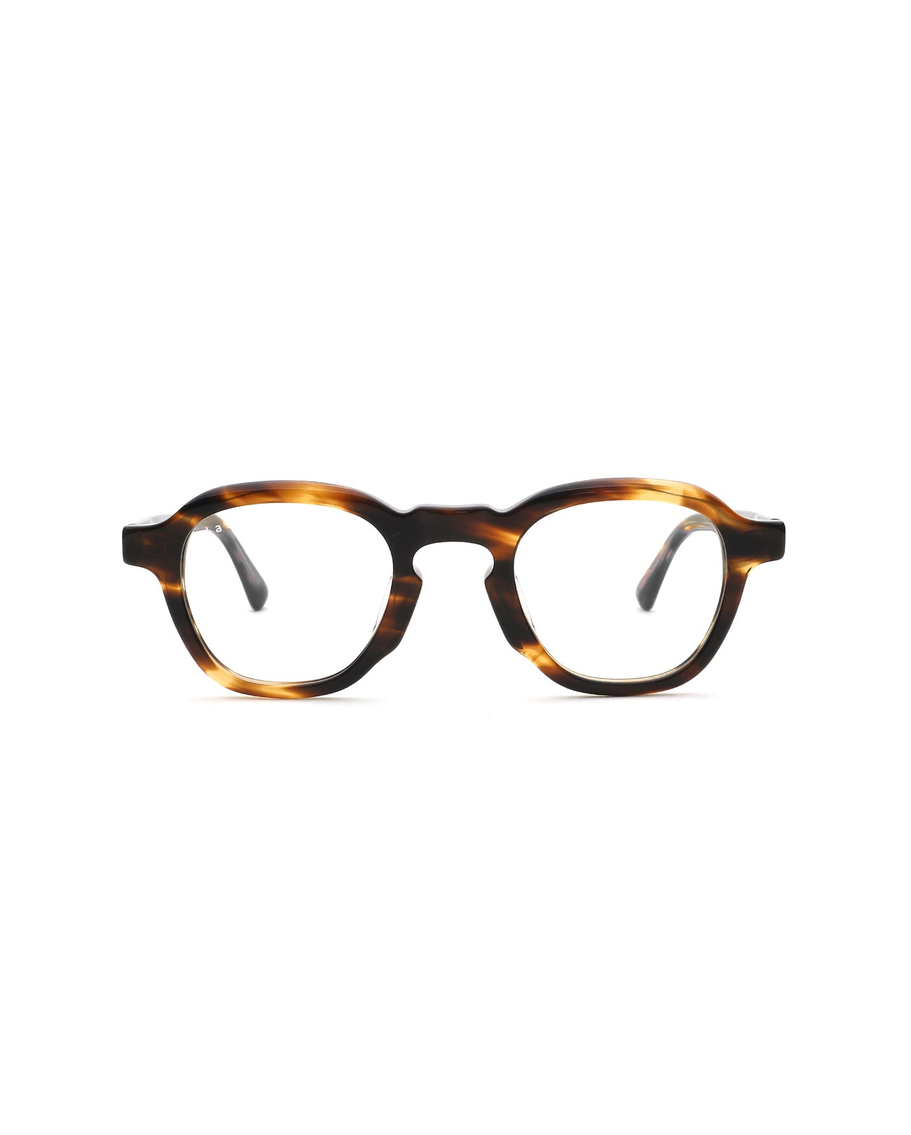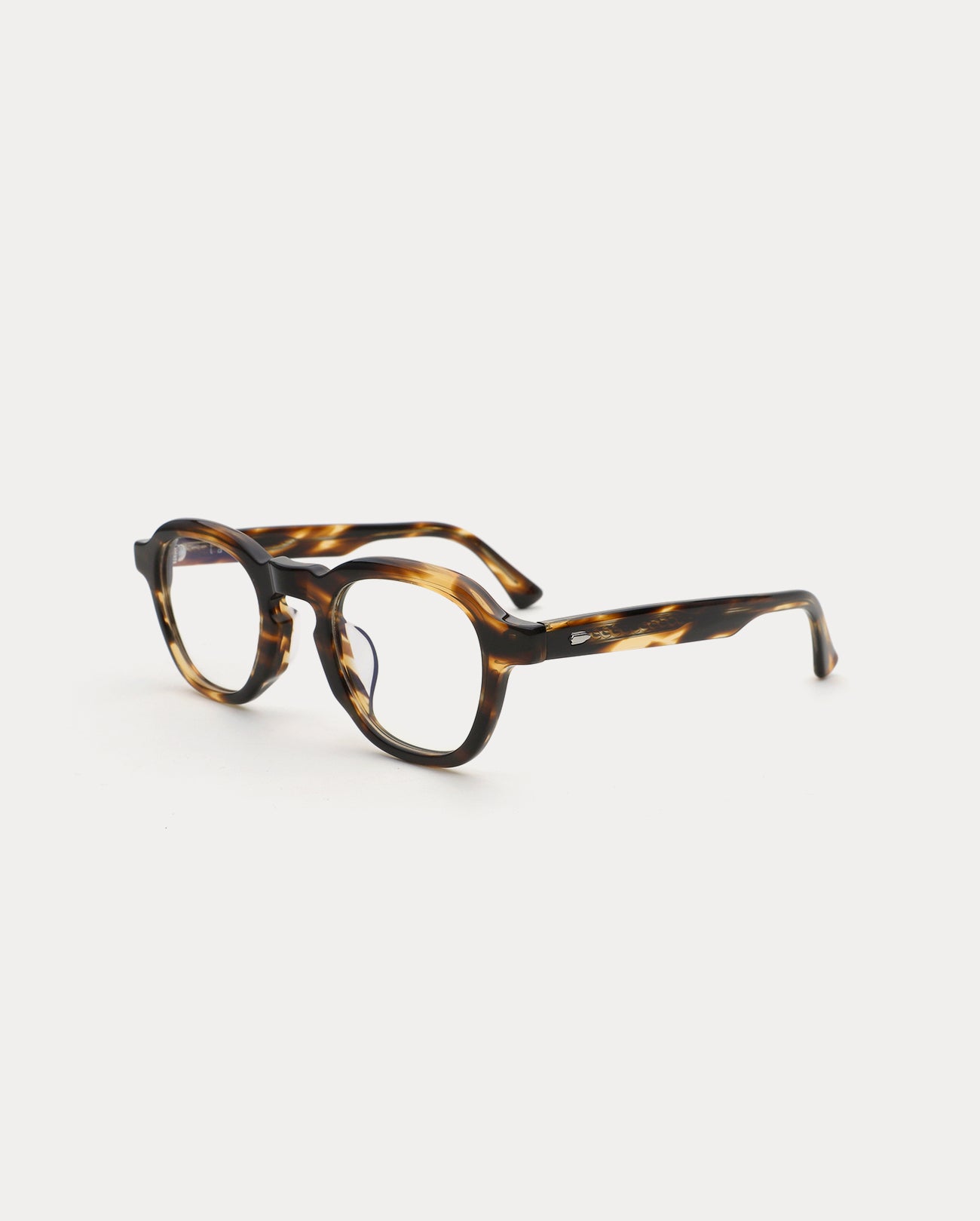 Square acetate optical frame. The acetate from Mazzucchelli which is applied as the base material for the frame shows luxurious color and luster. The front design without rivets presents a minimal look. Moderate thickness, the soft edges of the upper line, and the voluminous keyhole bridge present a soft mood. The metal core patterns reflected on the temples make the product more luxurious.
