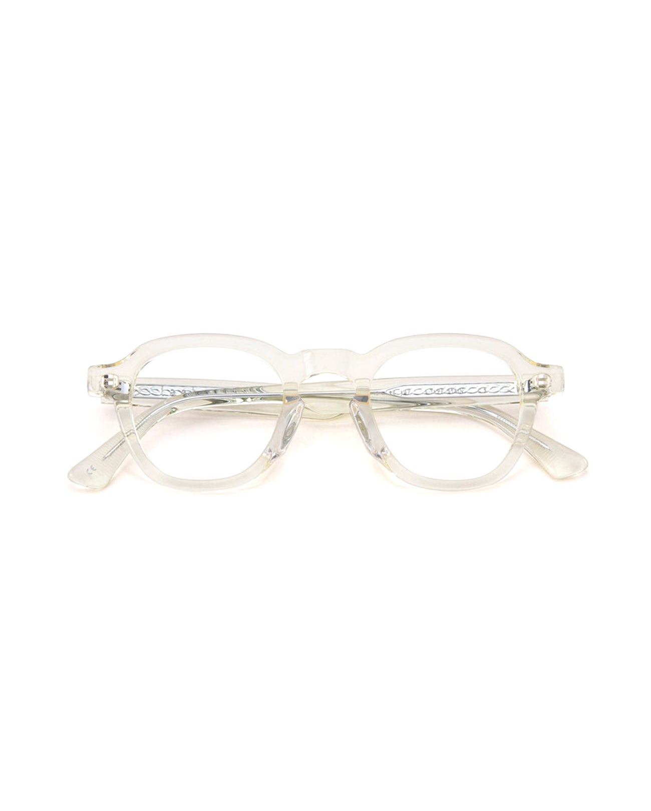 Square acetate optical frame. The acetate from Mazzucchelli which is applied as the base material for the frame shows luxurious color and luster. The front design without rivets presents a minimal look. Moderate thickness, the soft edges of the upper line, and the voluminous keyhole bridge present a soft mood. The metal core patterns reflected on the temples make the product more luxurious.
