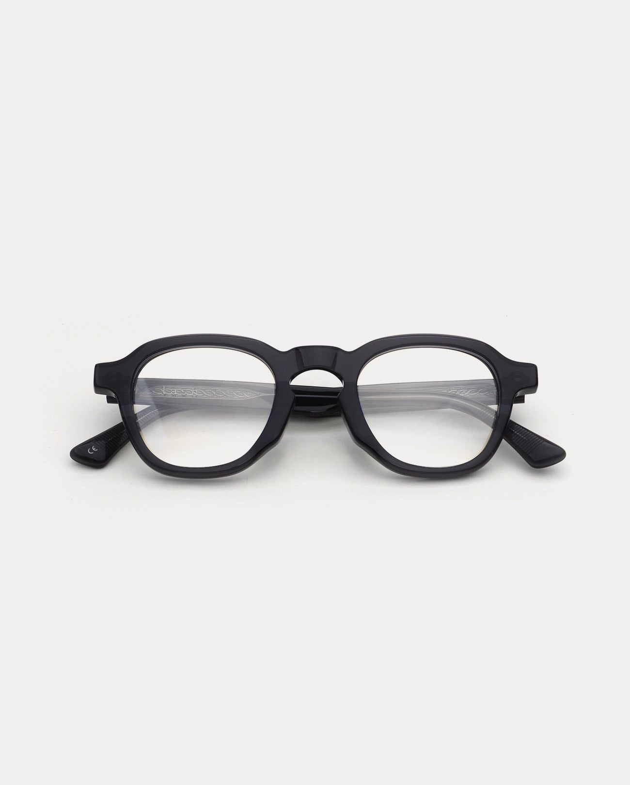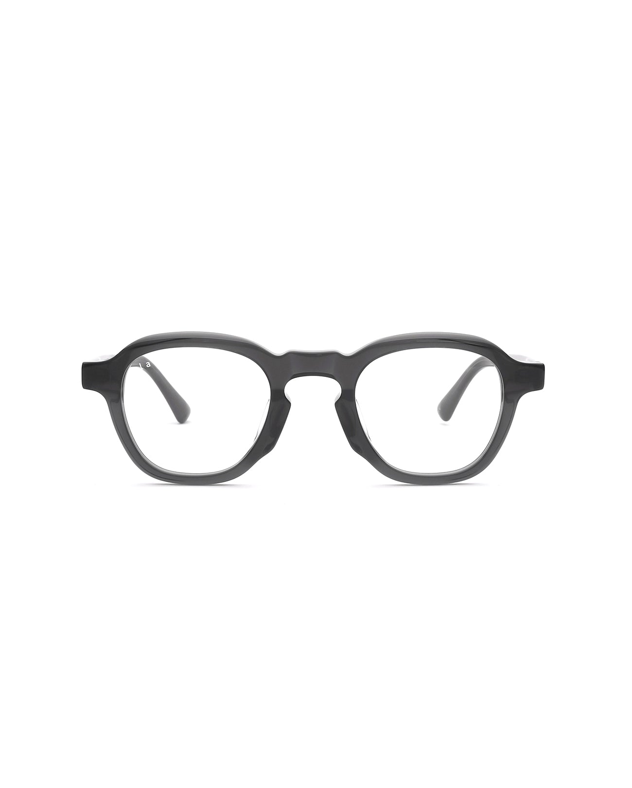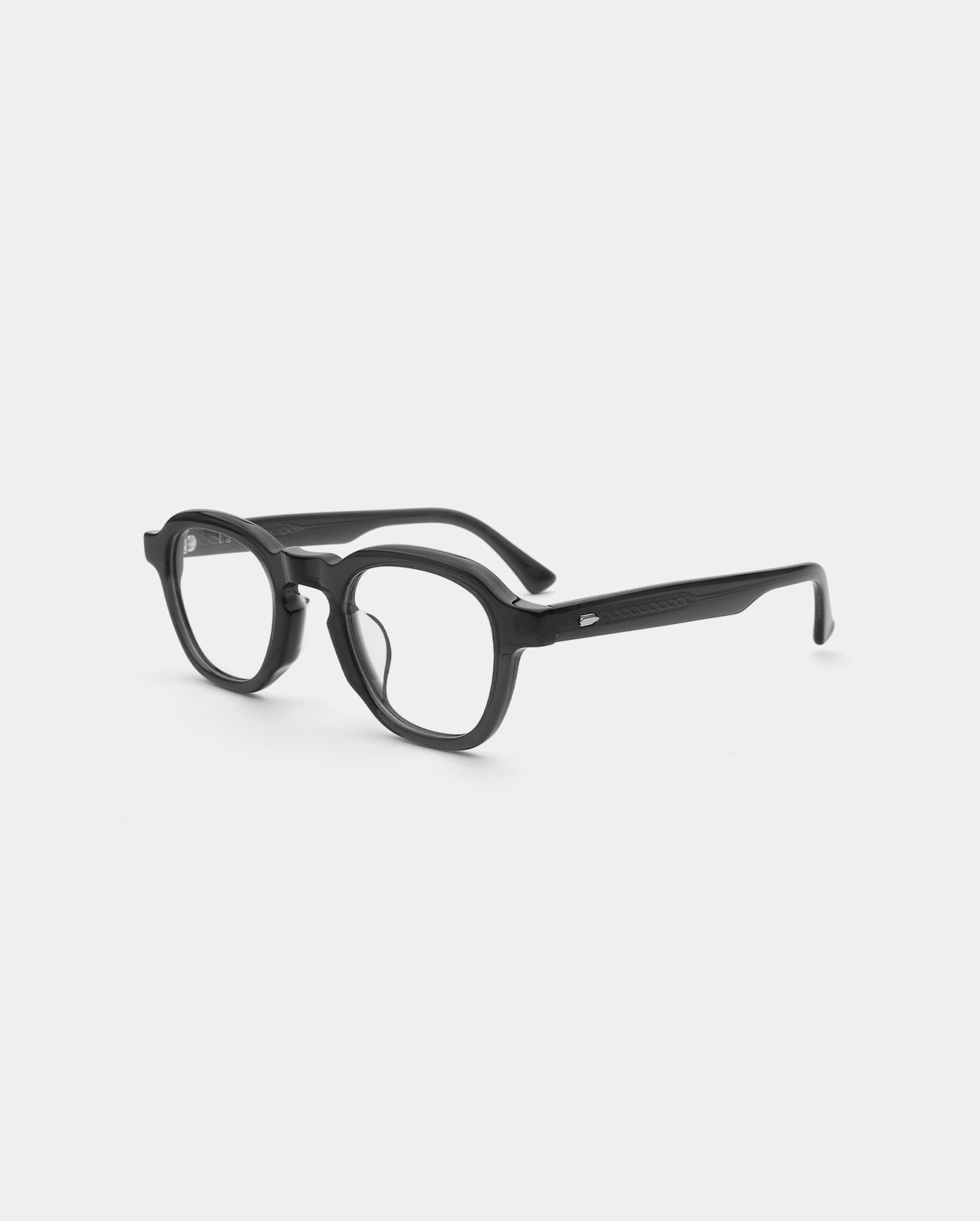 Square acetate optical frame. The acetate from Mazzucchelli which is applied as the base material for the frame shows luxurious color and luster. The front design without rivets presents a minimal look. Moderate thickness, the soft edges of the upper line, and the voluminous keyhole bridge present a soft mood. The metal core patterns reflected on the temples make the product more luxurious.