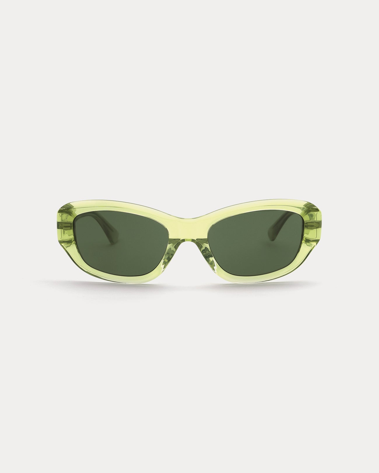 Square acetate Sunglass frame. The front curve is designed to be round, and the upper line and the lens part are designed sophisticatedly. In addition, its overall bold shape gives a strong impression.