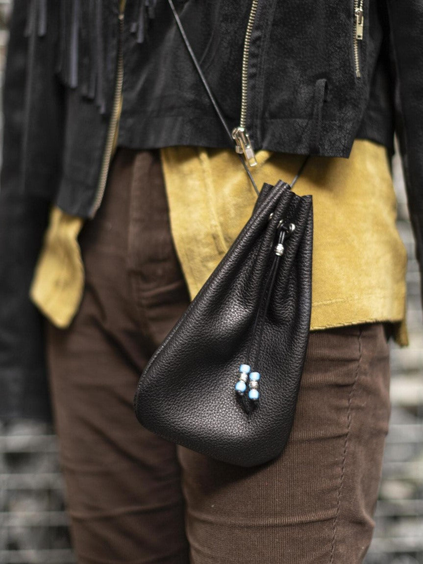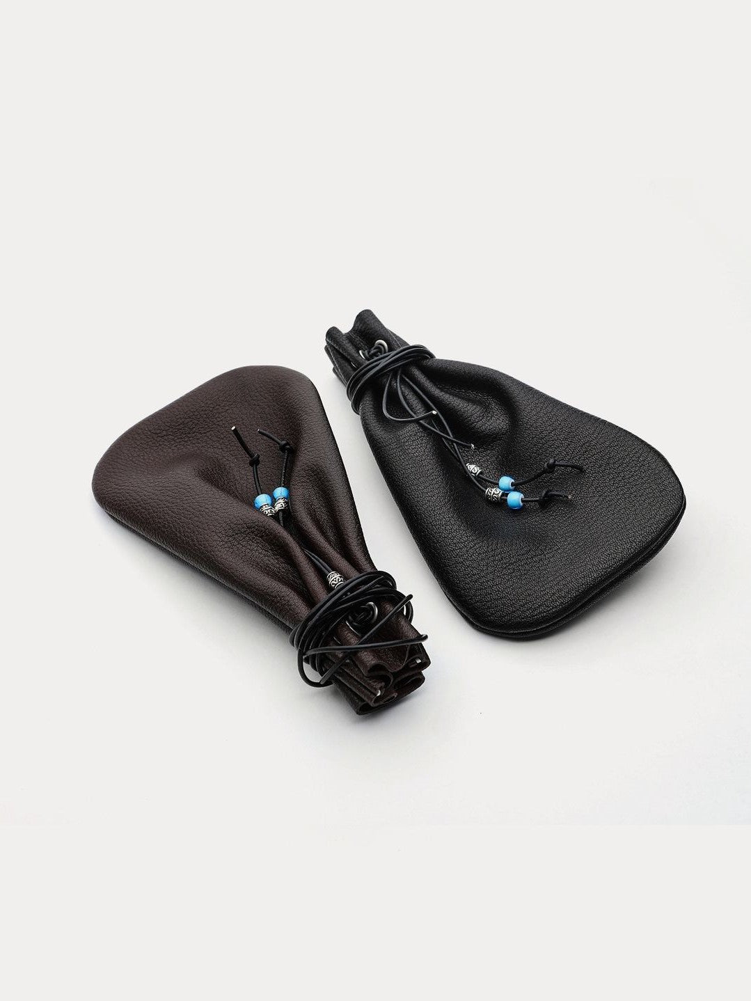 This small pouch is crafted using metal and Czech white beads with a 2mm thick genuine leather strap and stopper and accents.
